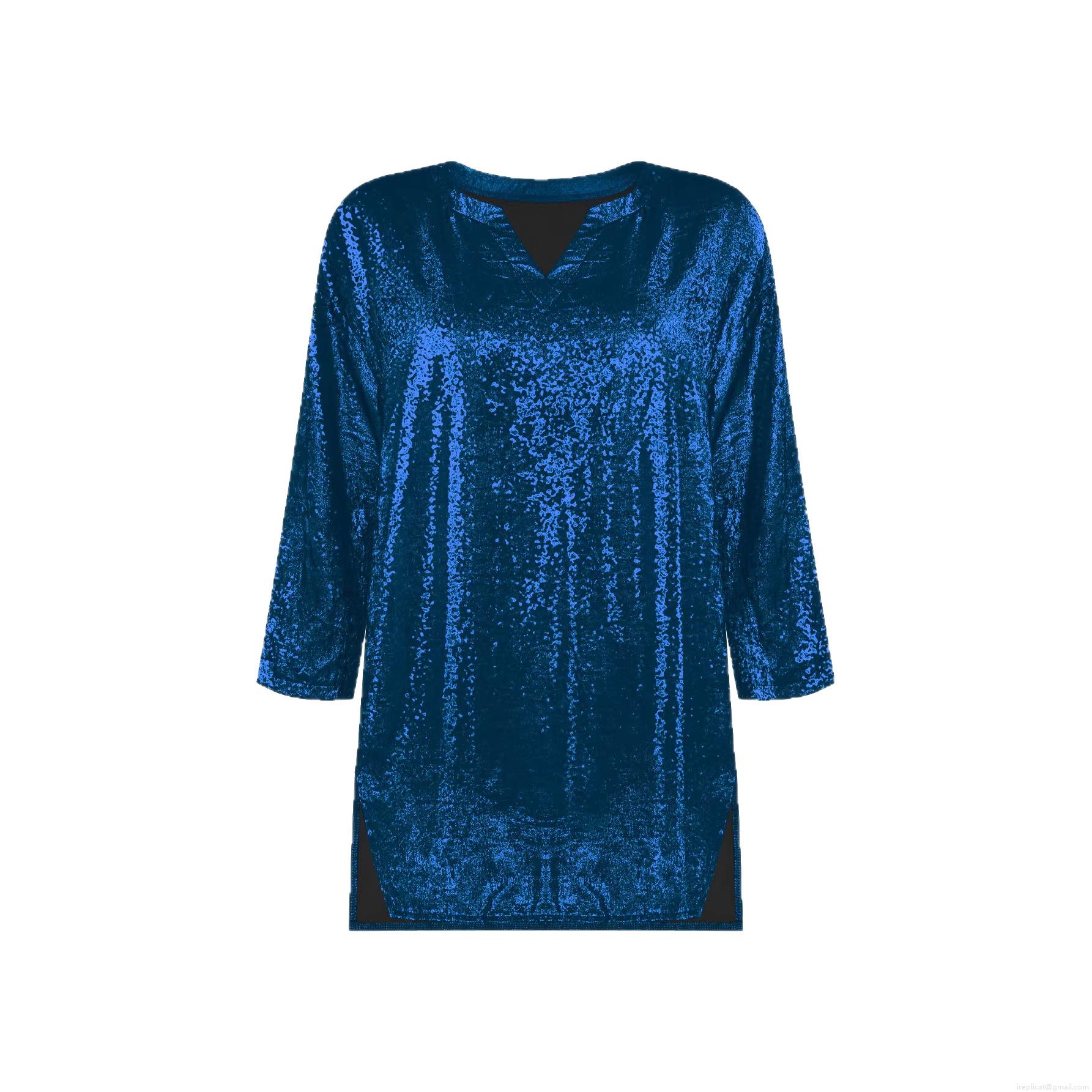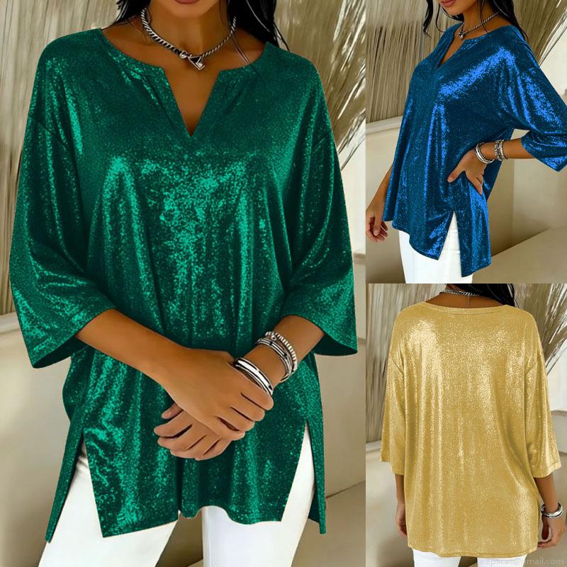 • Women's Plus Size Sequin T-Shirt V-Neck 3/4 Sleeve Loose Glitter Top Side Slit Shiny Polyester Blouse For Party Club Streetwear