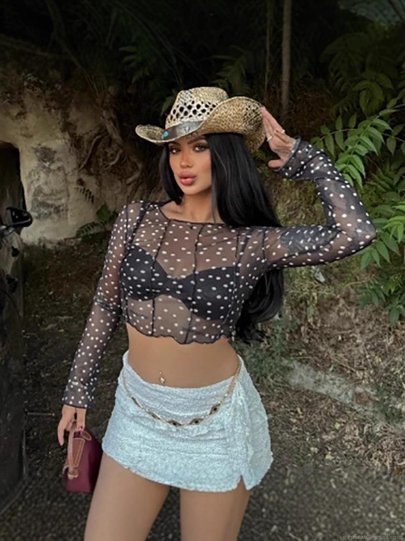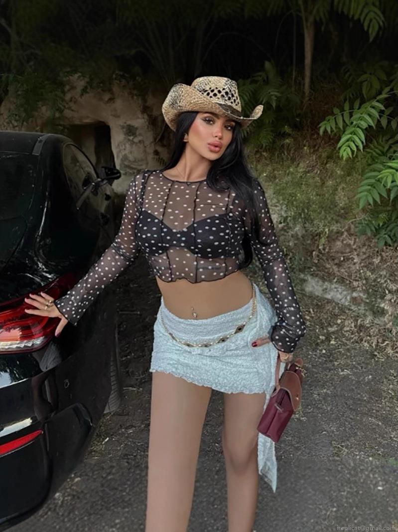 • Women's Polka Dot Sheer Mesh Crop Top Round Neck Long Sleeve Lettuce Trim Slim Fit Sexy Streetwear Tee Shirt For Summer Party 95% Polyester 5% Elastane