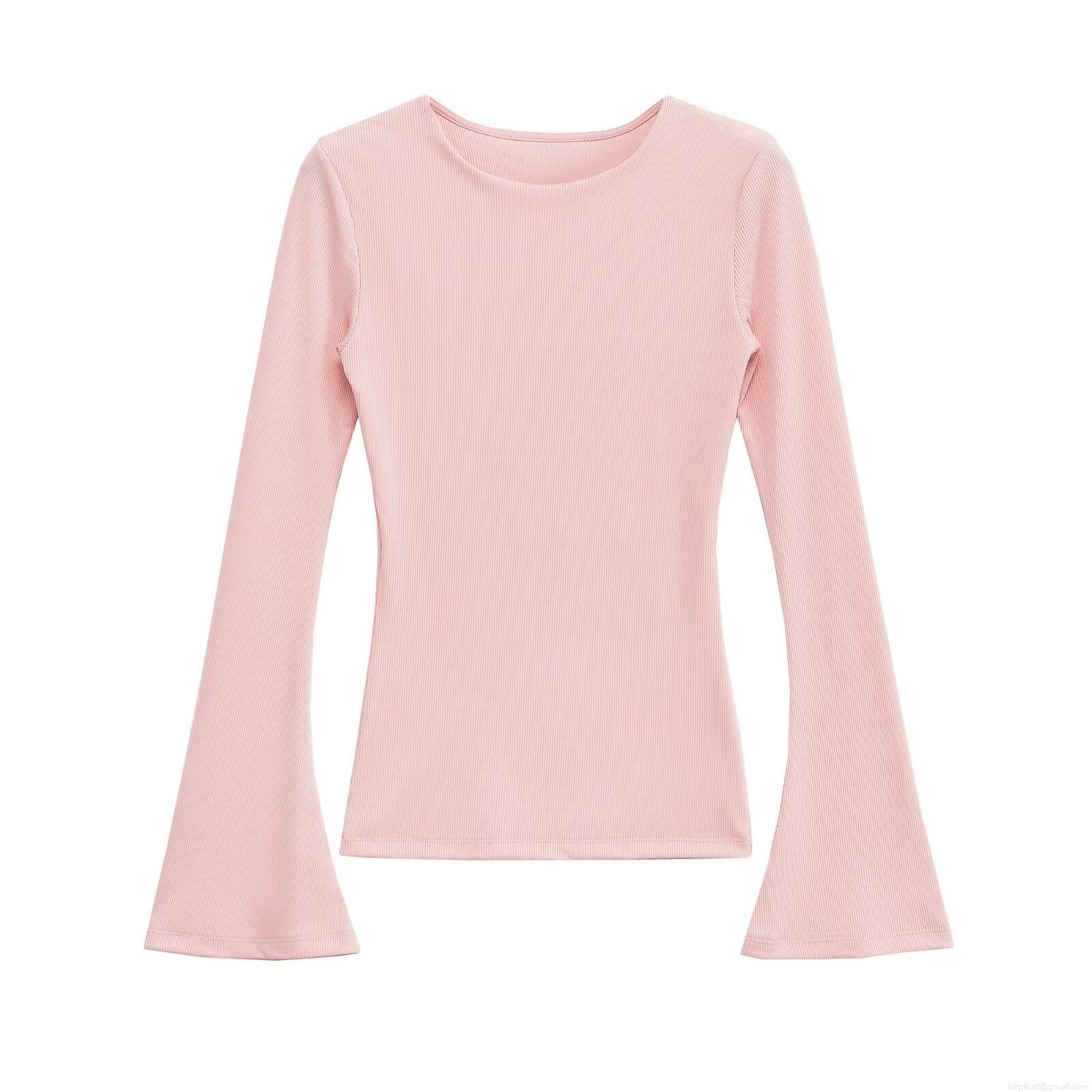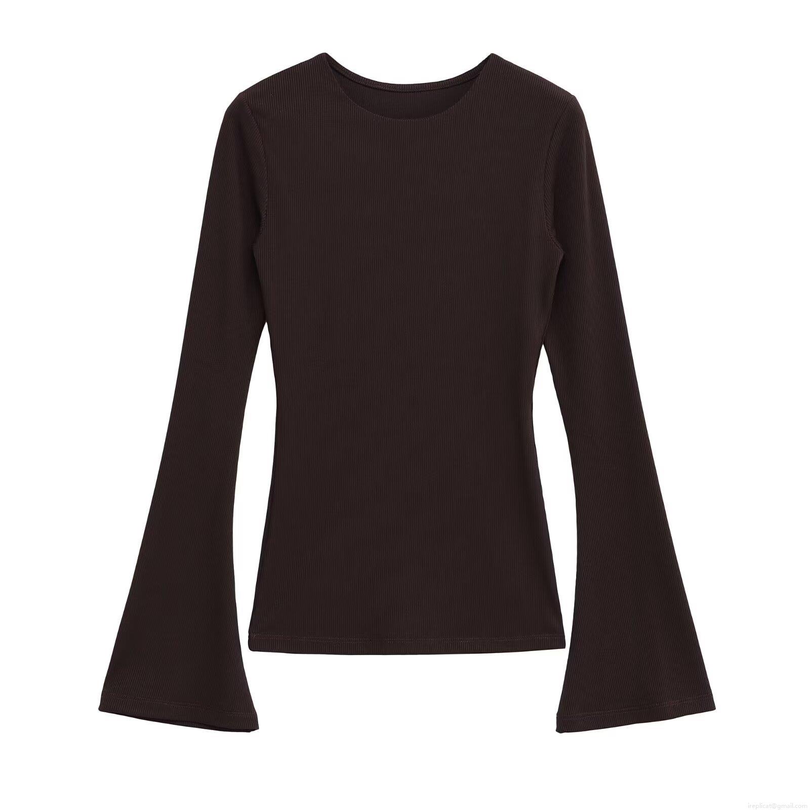 • Women's Ribbed Knit T-Shirt Flare Sleeve Round Neck Slim Fit Long Sleeve Top Solid Color Polyester Spandex Tee For Spring Autumn Casual Streetwear