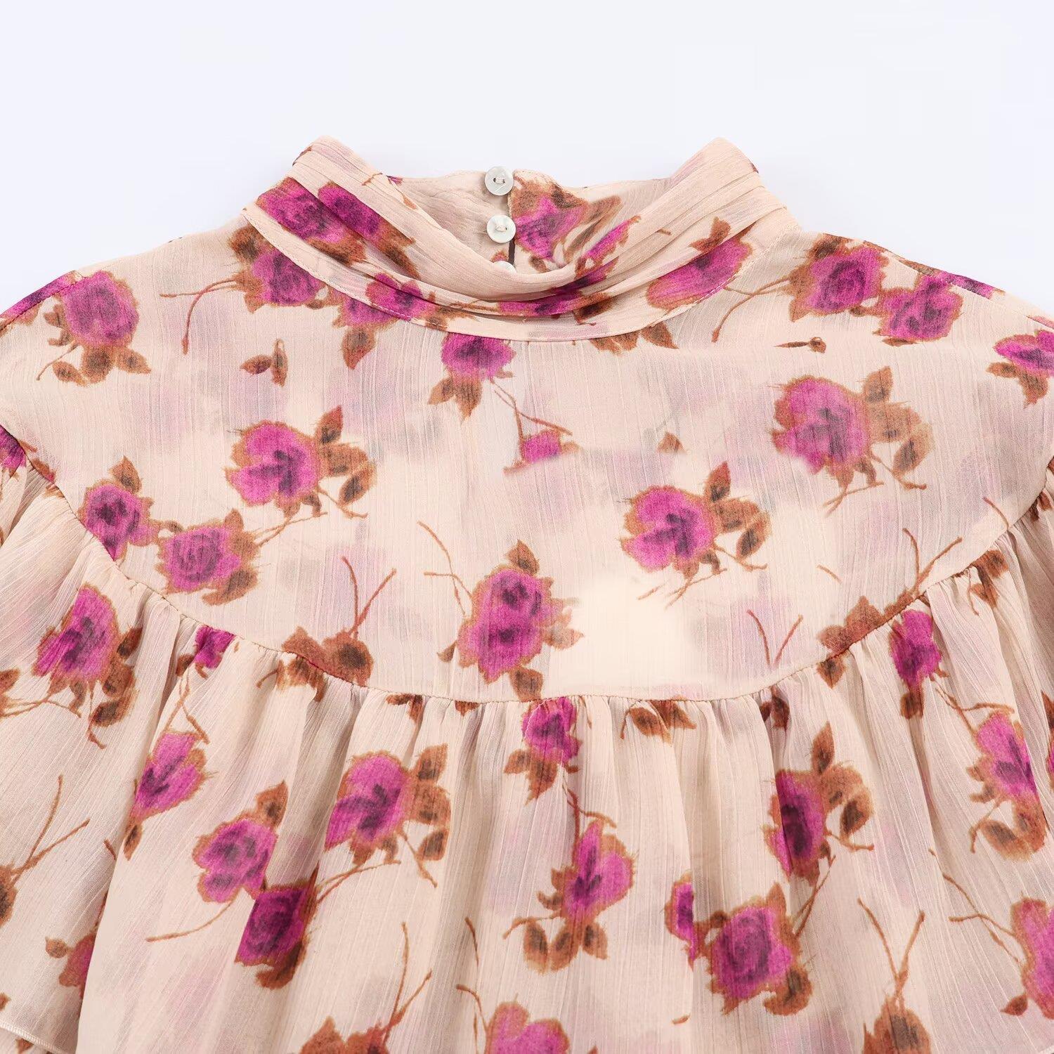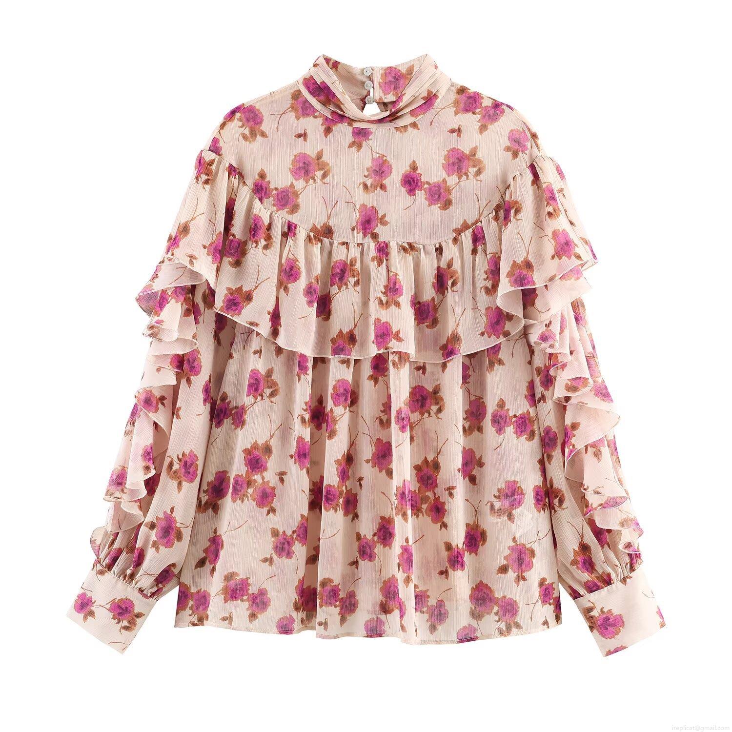 • Women's Romantic Floral Chiffon Blouse Mock Neck Layered Ruffle Long Sleeve Shirt Elegant Spring Autumn Pullover Tops for Women