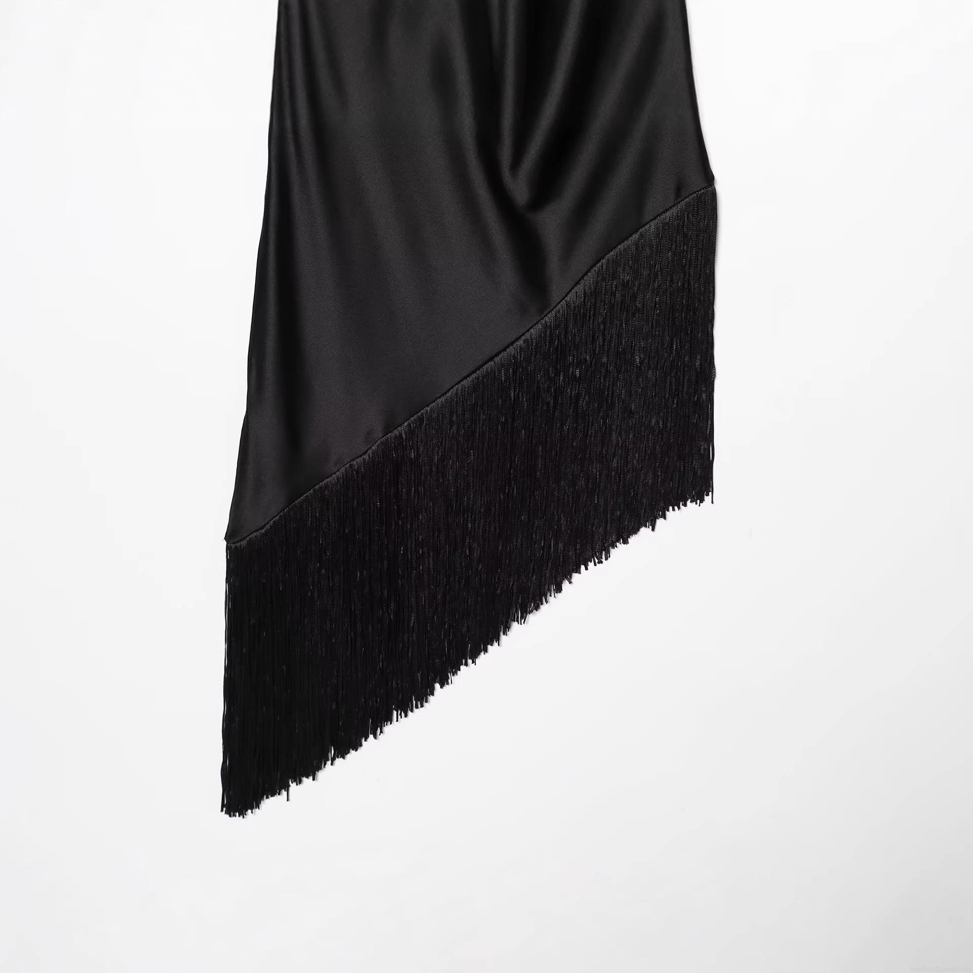 Women's Satin Cowl Neck Sleeveless Top Asymmetric Hem Long Tassel Fringed Blouse Elegant Party Streetwear Solid Black Polyester Satin Shirt