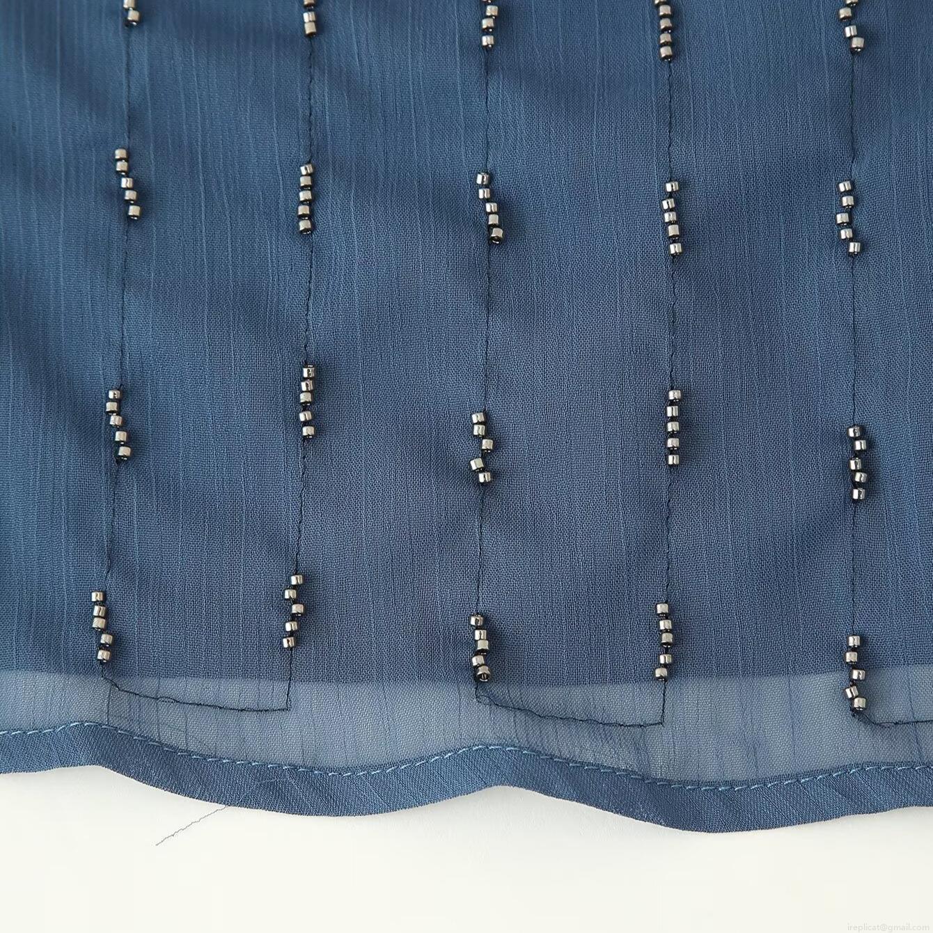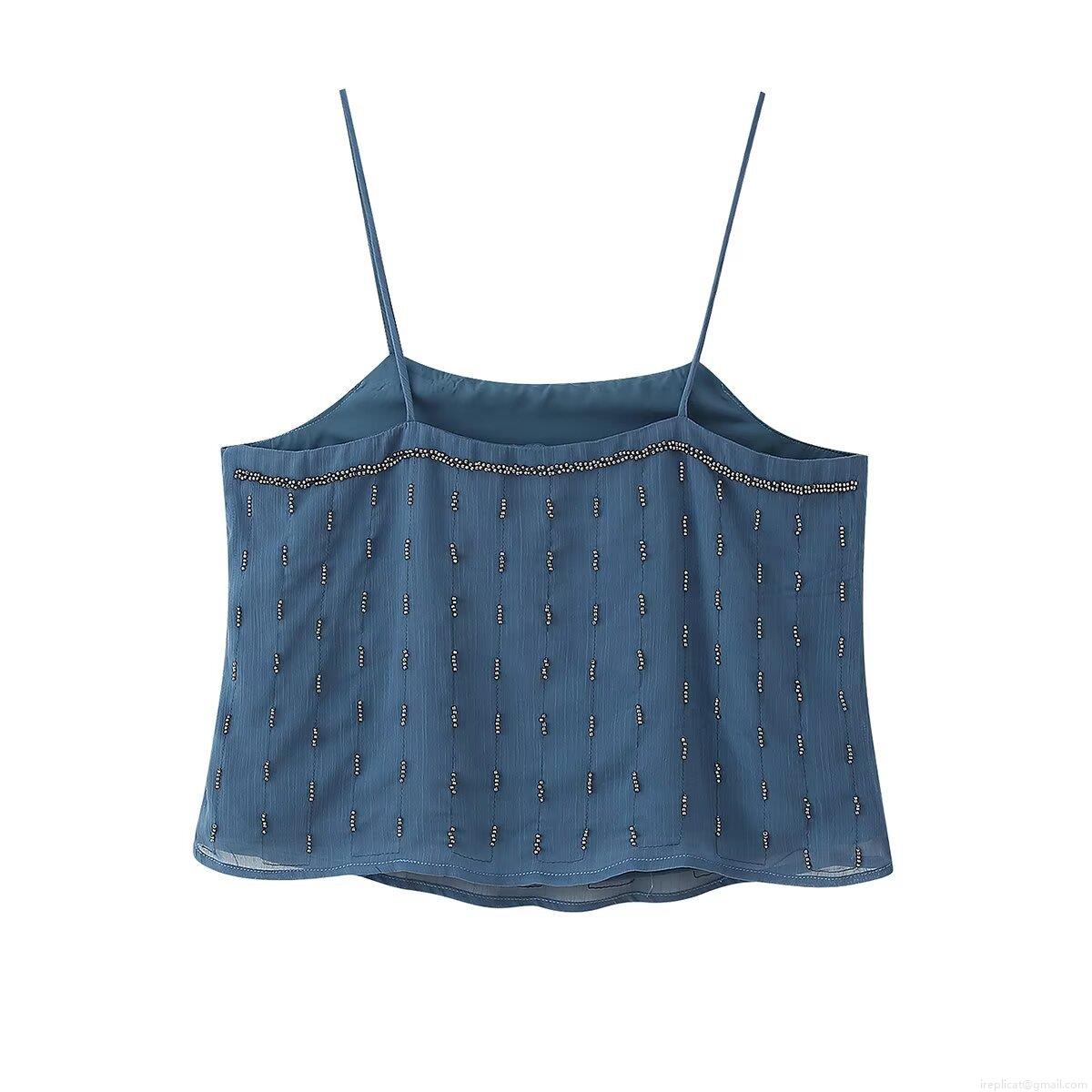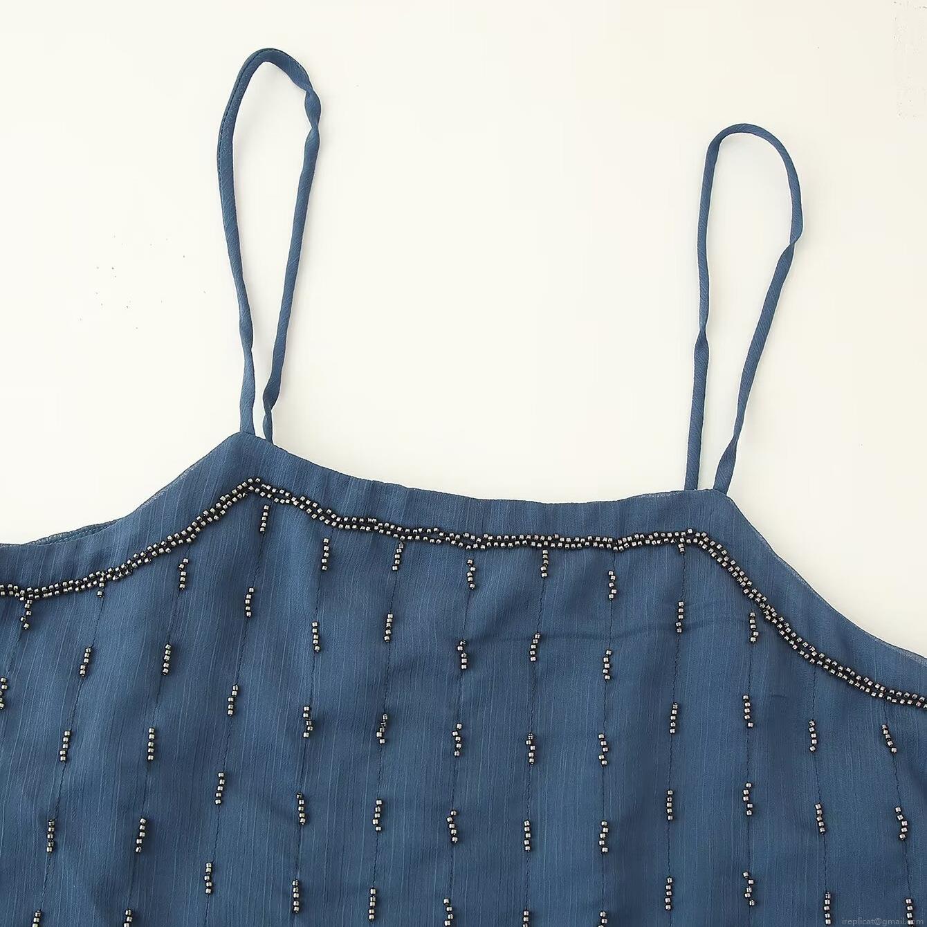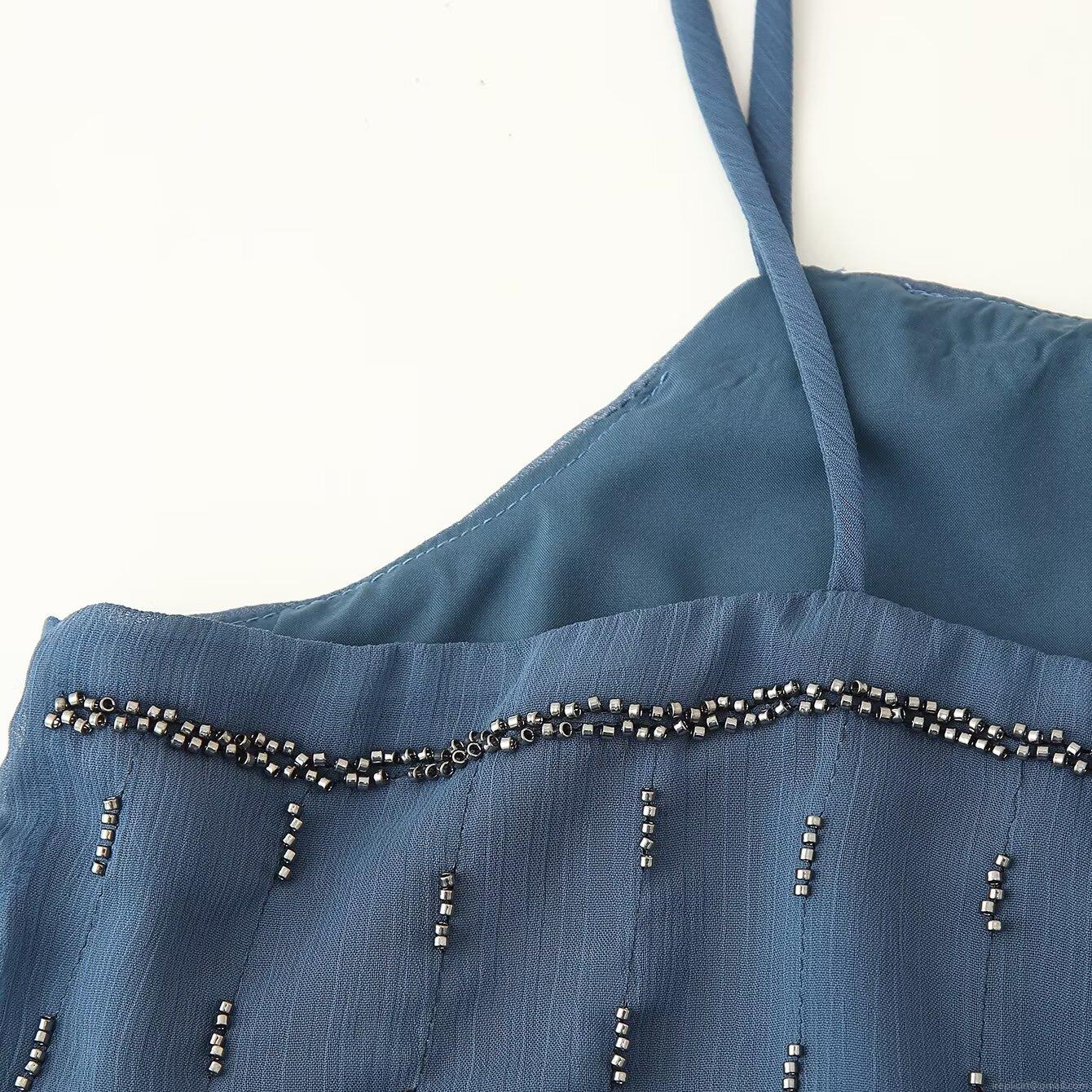 • Women's Sexy Backless Beaded Cami Top Summer Fashion Dark Blue Spaghetti Strap Chiffon Tank Top For Dating Party Clubwear