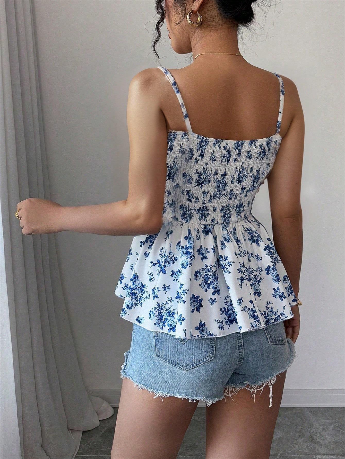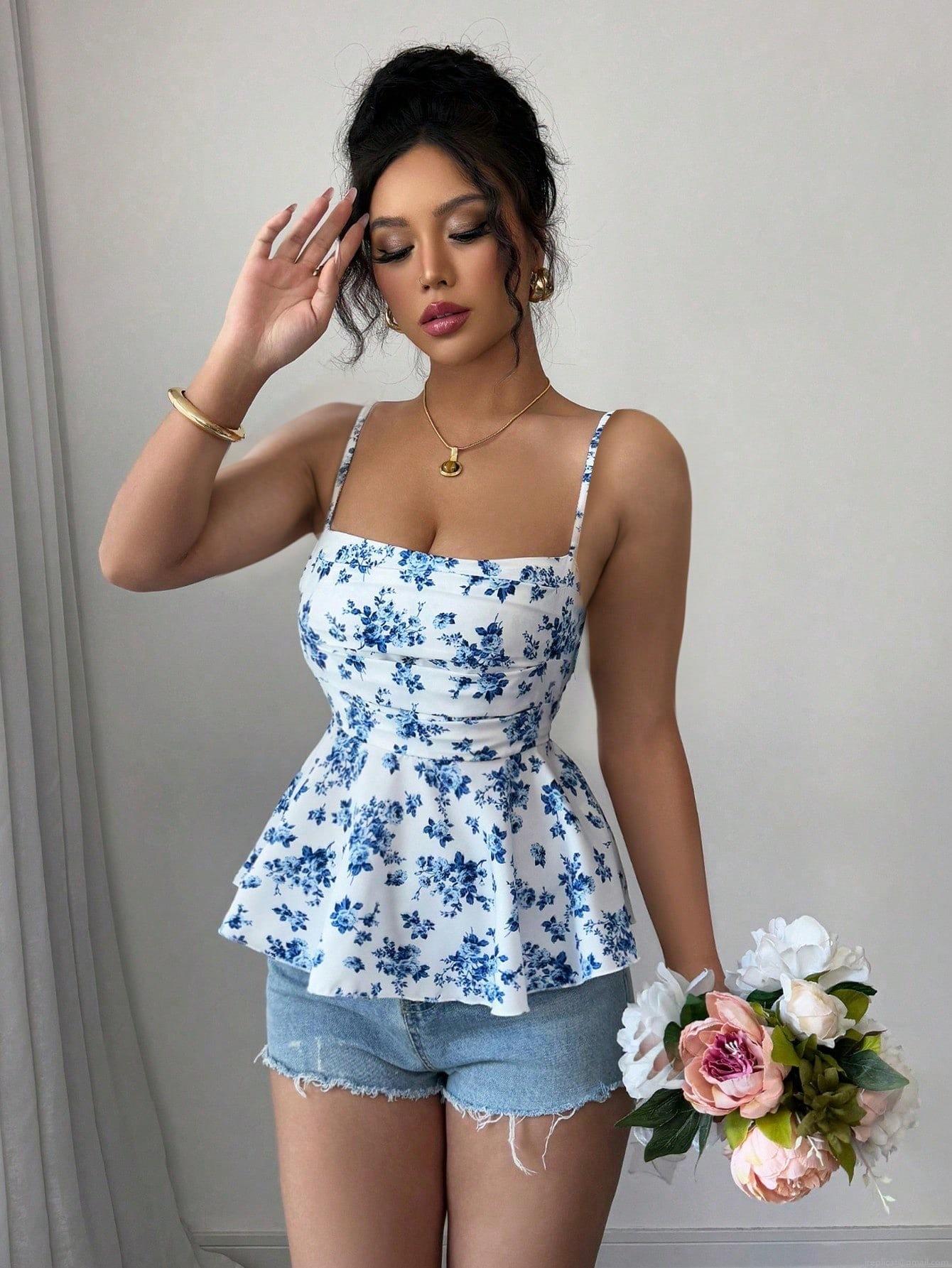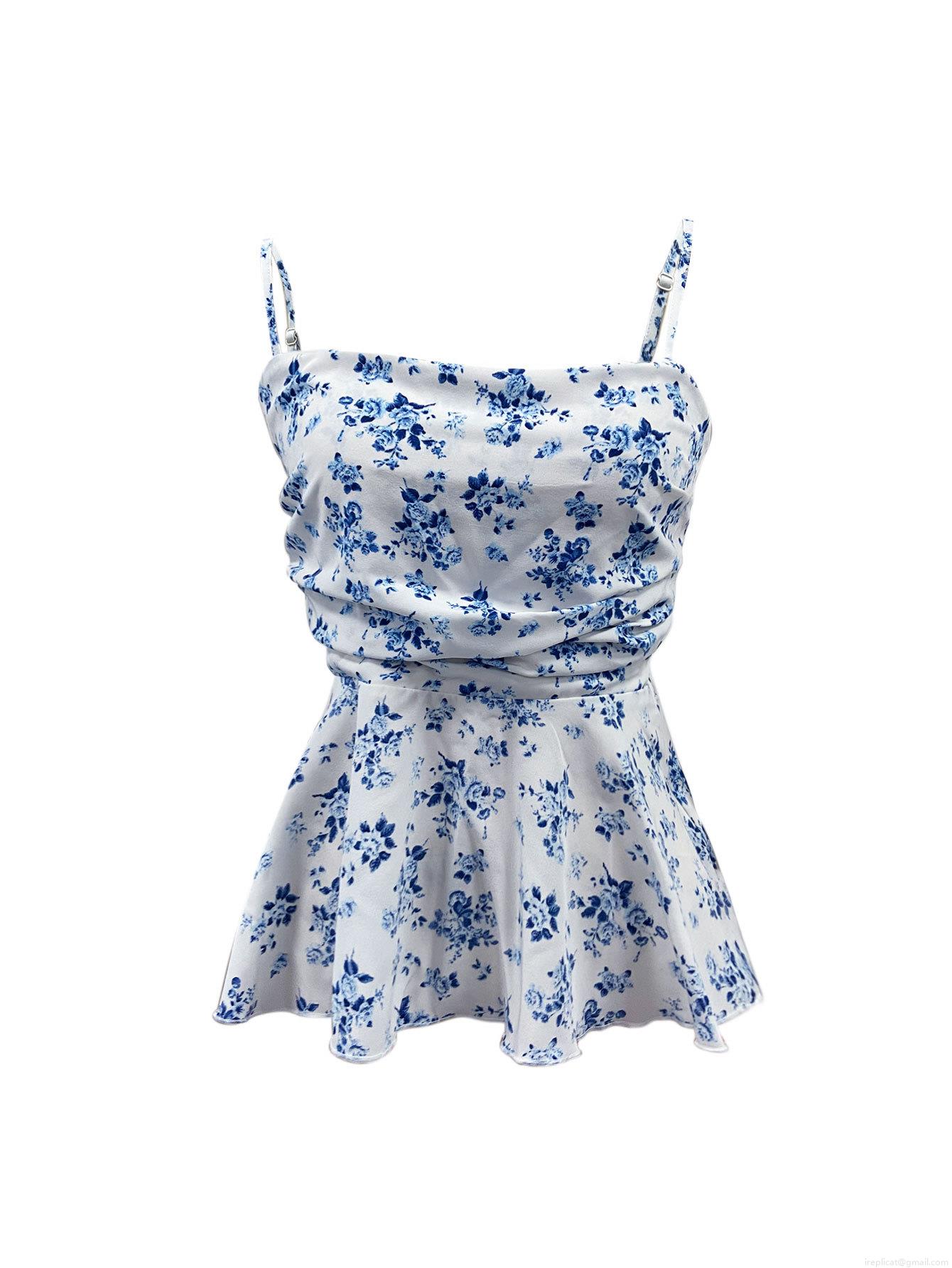 • Women's Sexy Blue and White Floral Camisole Peplum Hem Spaghetti Strap Polyester Slim Fit Sexy Sleeveless Top for Summer Vacation Beach