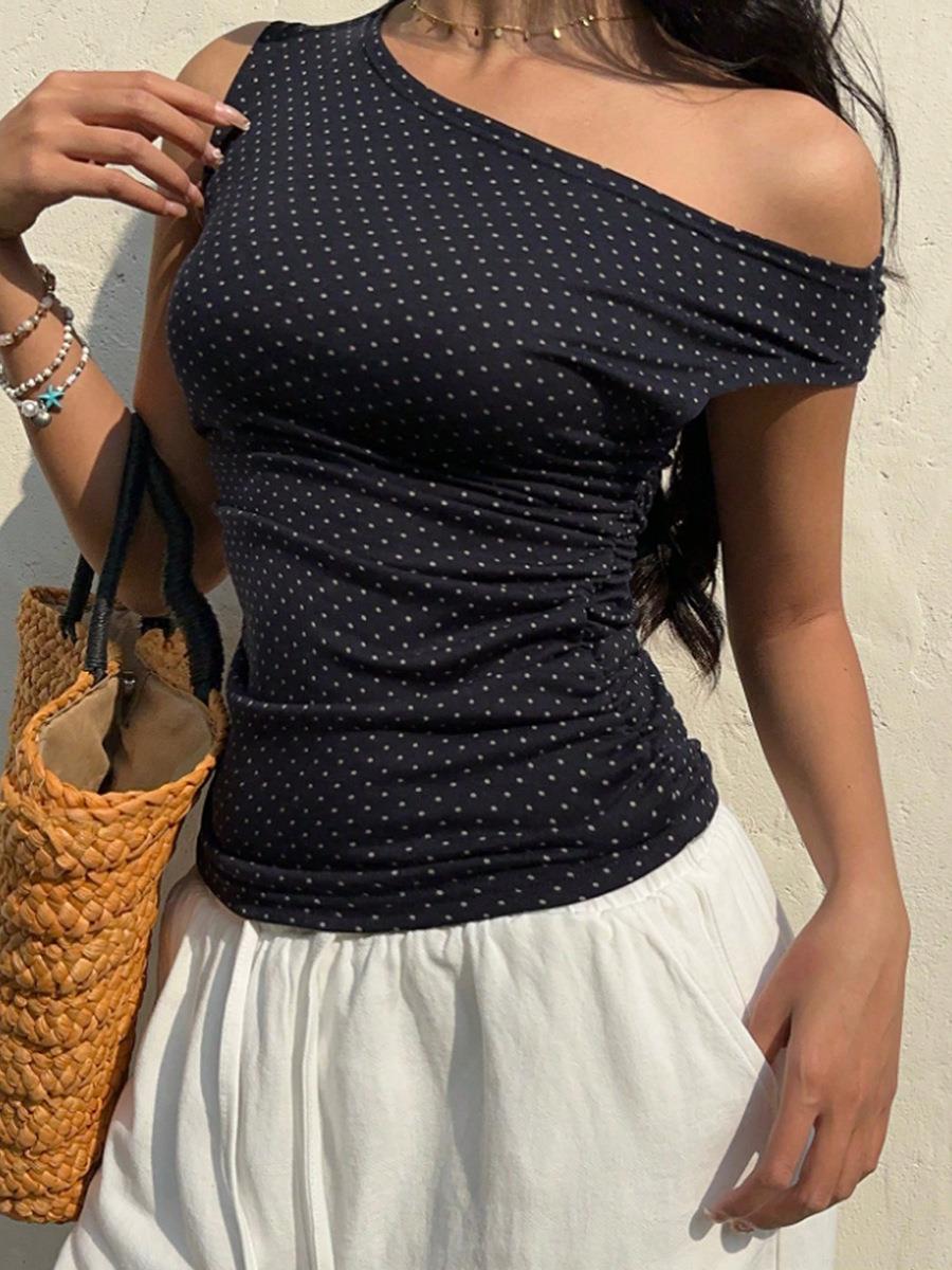 • Women's Sexy One Shoulder Polka Dot Tank Top Polyester Spandex Slim Fit Ruched Rhinestone Sleeveless Shirt For Summer Vacation Party Ladies