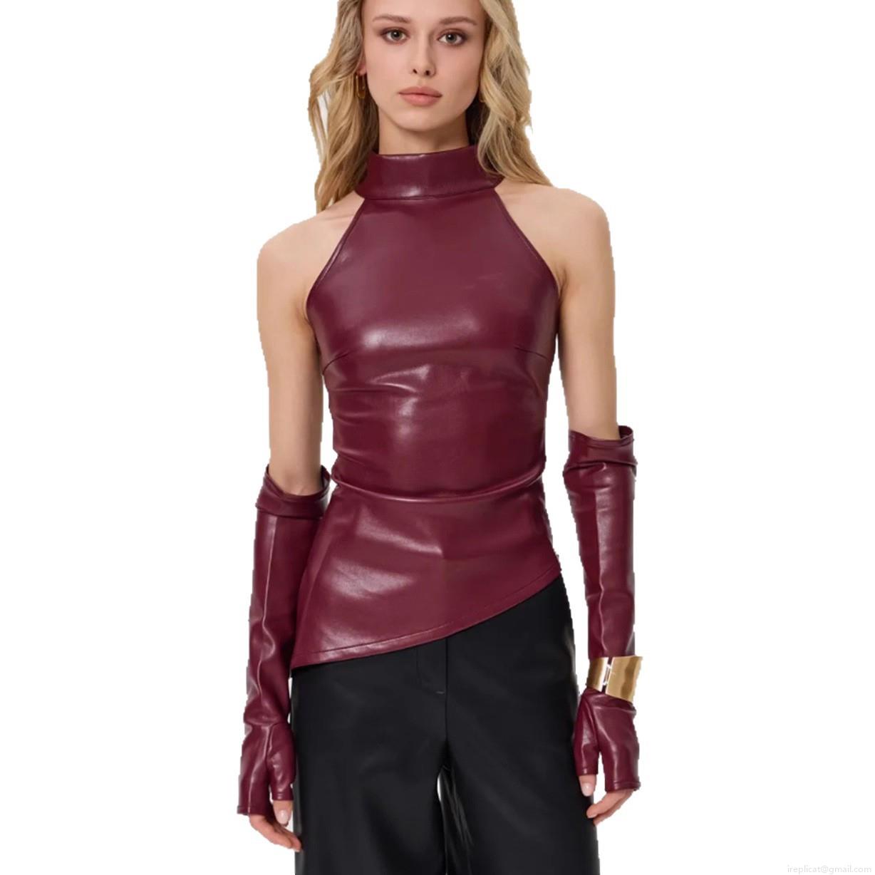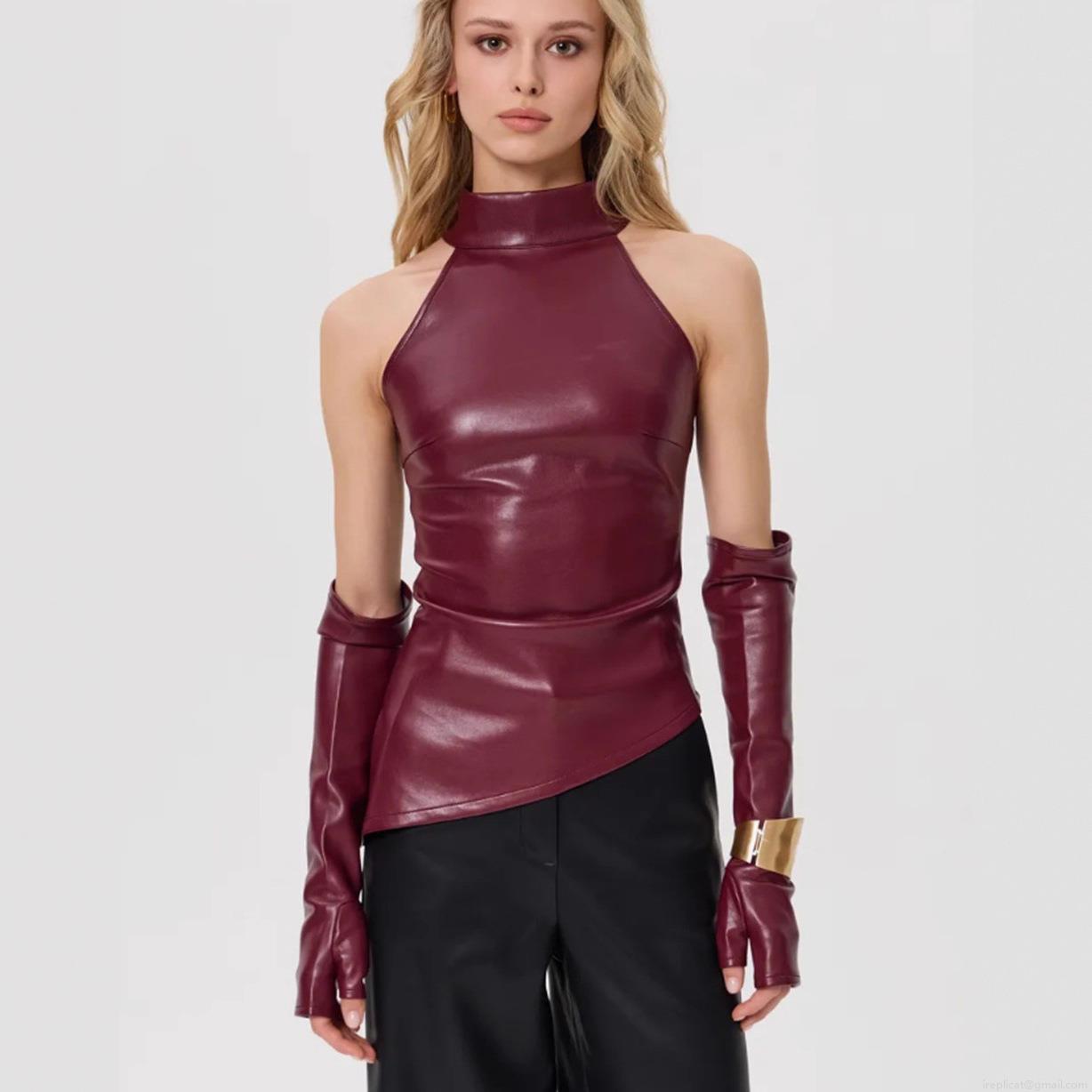• Women's Sexy PU Leather Halter Top Set With Matching Long Sleeves Gloves Off-Shoulder Irregular Hem Slim Fit Tank Top For Club Party Streetwear Faux Leather Top