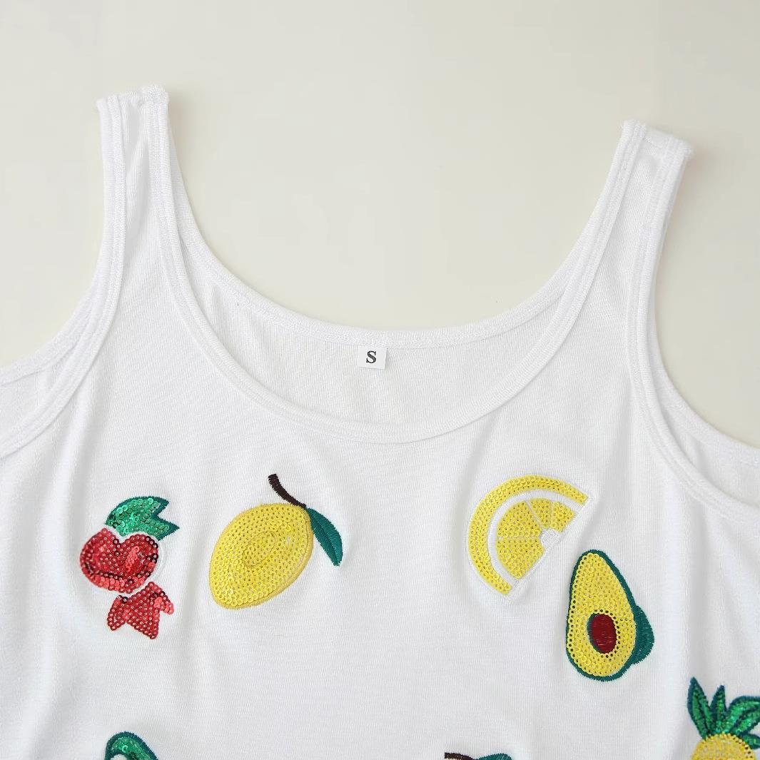 • Women's Sexy White Fruit Sequin Embroidery Ribbed Knit Crop Tank Top Sweet Sleeveless Slim Fit Summer Top with Avocado Lemon Watermelon Cherry Patterns