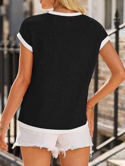 Women's Short Sleeve T-Shirt Ribbed Knit Color Block Contrast Trim Crew Neck Casual Loose Summer Tee Top With Chest Pocket