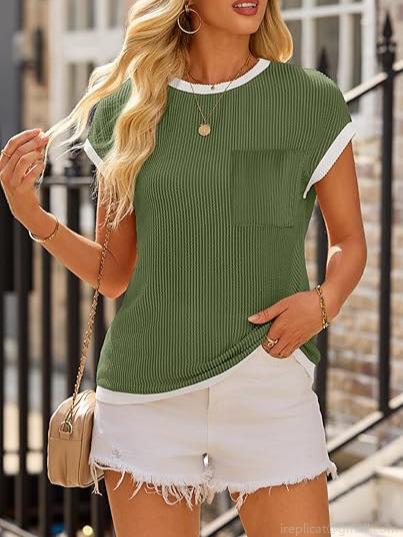 • Women's Short Sleeve T-Shirt Ribbed Knit Color Block Contrast Trim Crew Neck Casual Loose Summer Tee Top With Chest Pocket