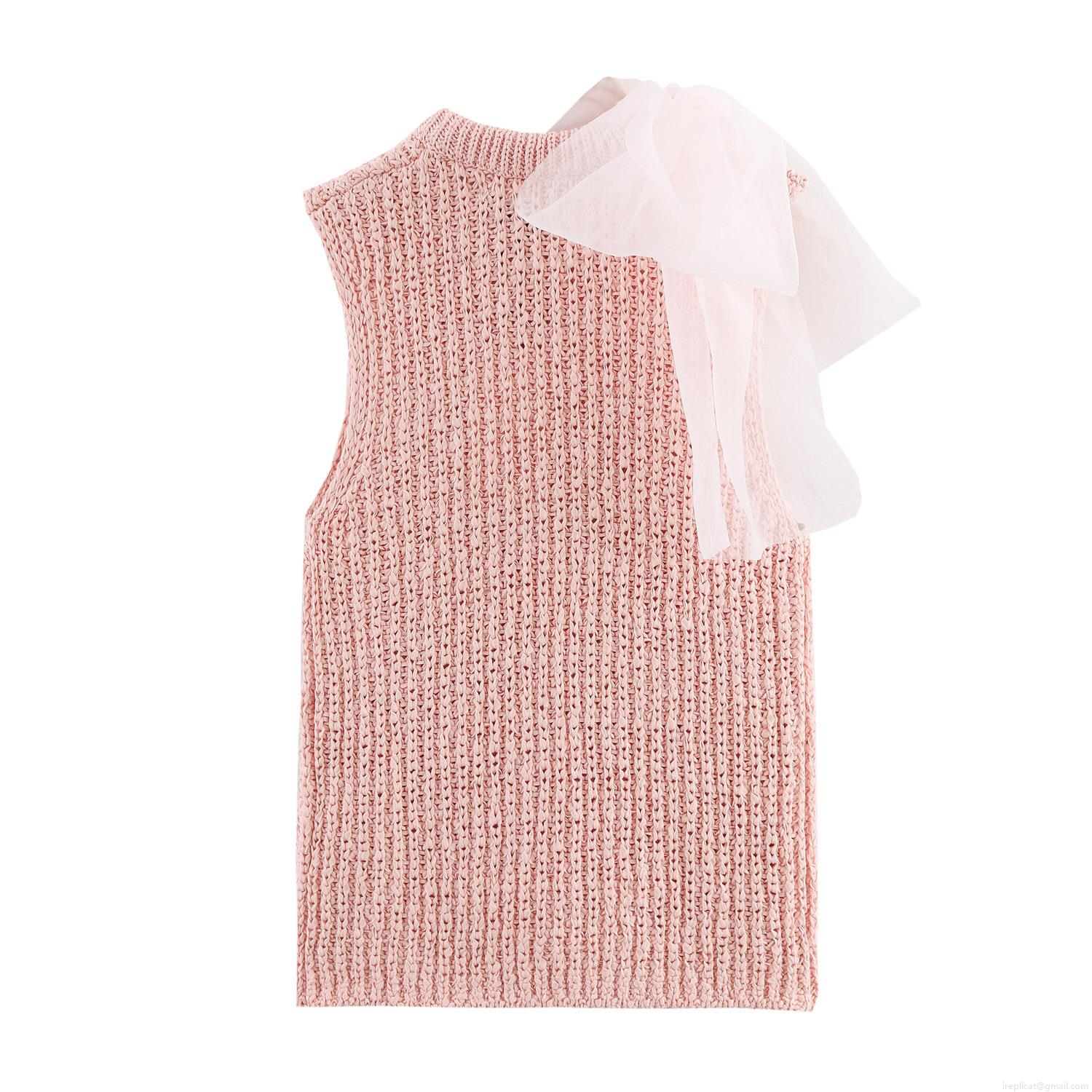• Women's Sleeveless Knit Top With Oversized Organza Bow Accent Crew Neck Slim Fit Ribbed Tank Top Elegant Chic Summer Knitwear Lotus Pink