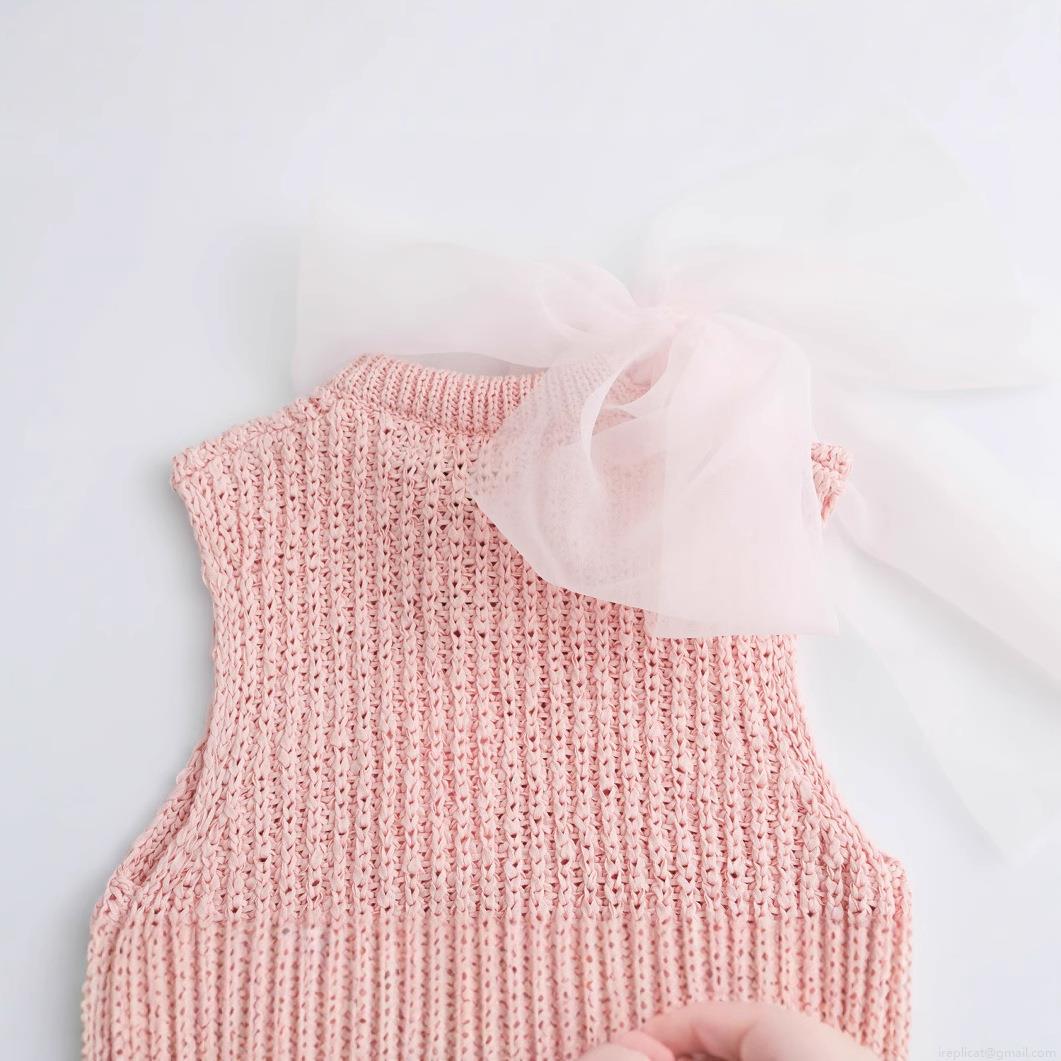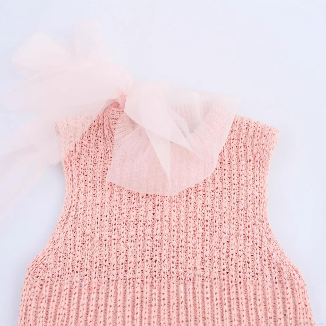 Women's Sleeveless Knit Top With Oversized Organza Bow Accent Crew Neck Slim Fit Ribbed Tank Top Elegant Chic Summer Knitwear Lotus Pink