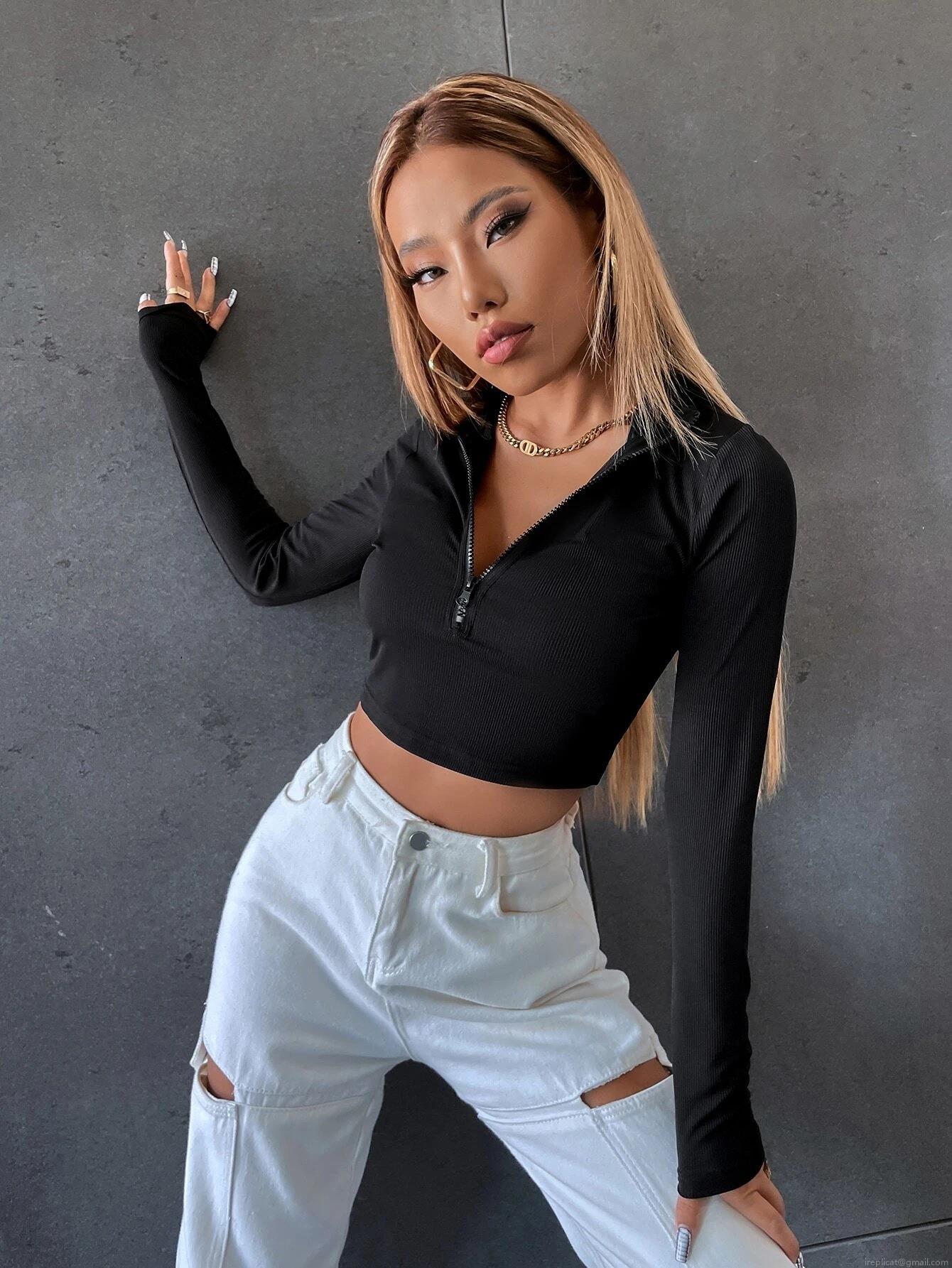 • Women's Slim Fit Ribbed Knit Crop Top With Quarter Zipper Stand Collar Long Sleeve Sexy Y2K Style Polyester Elastane Blend Streetwear Pullover For Autumn Winter Daily Wear