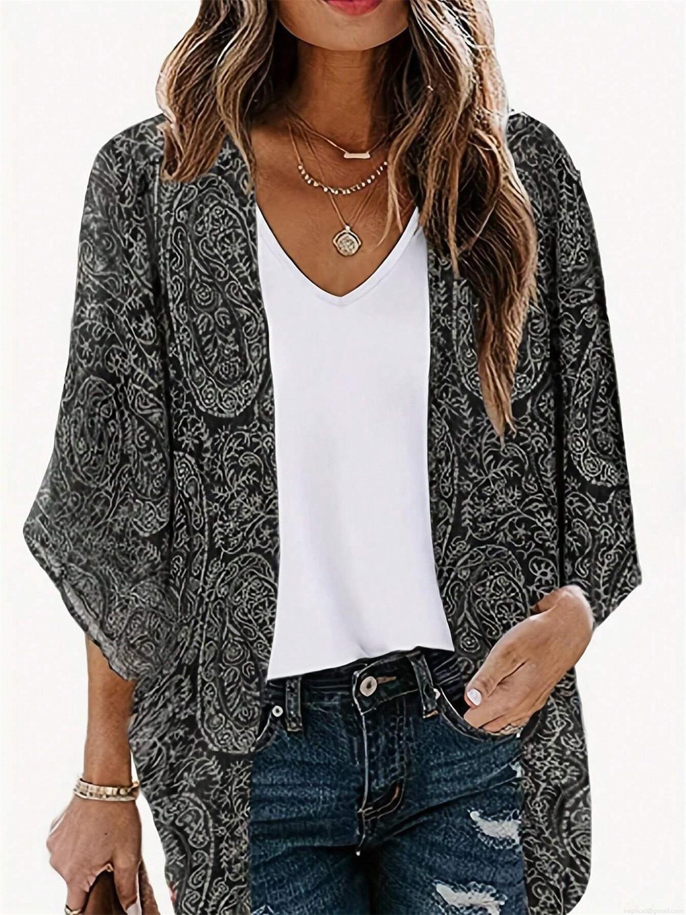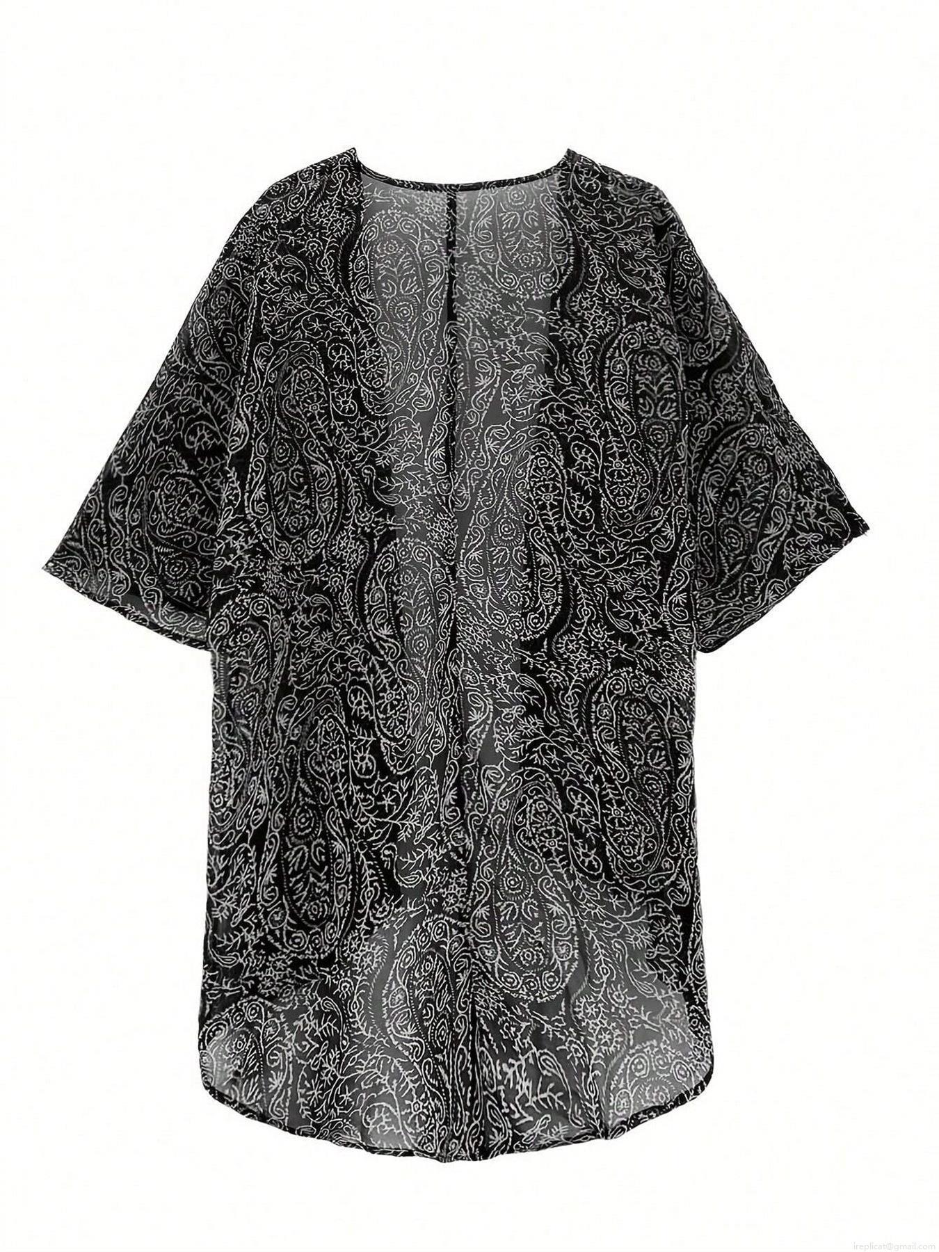 • Women's Summer Paisley Print Chiffon Cardigan Loose Casual Open Front 3/4 Sleeve Kimono Cover Up Shirt Long Tops