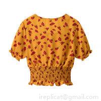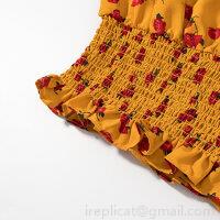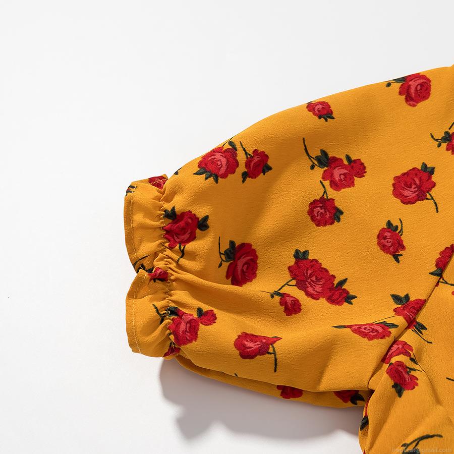 Ruffles, Printing, Navel Exposed, Puff Sleeves, Elastic Pleats, Red Roses With Floral Patterns