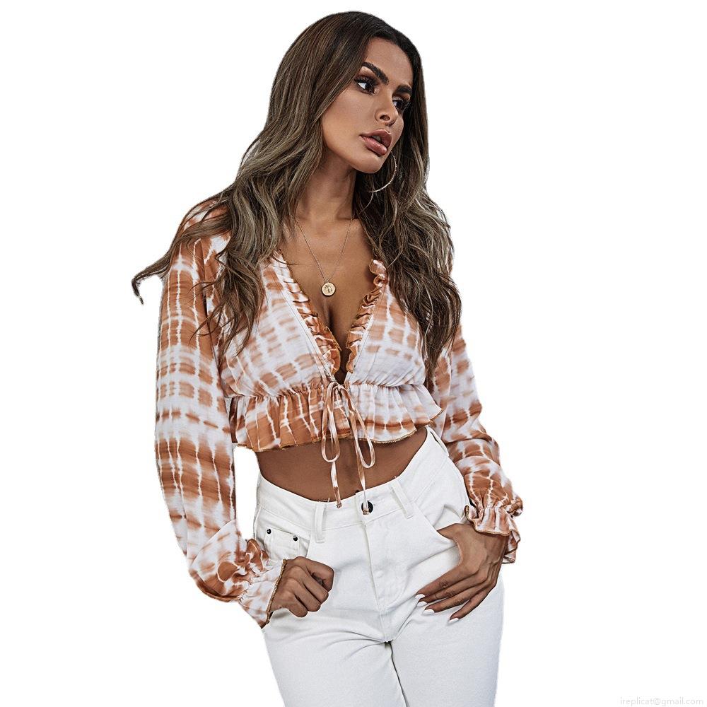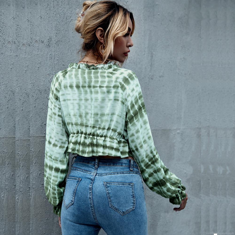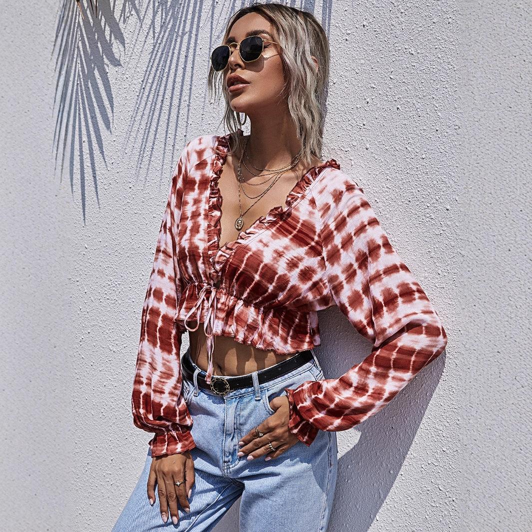 • Women's Tie Dye Crop Top Long Sleeve V-Neck Drawstring Ruffle Hem Bohemian Vacation Cotton Blouse Casual Summer Shirt