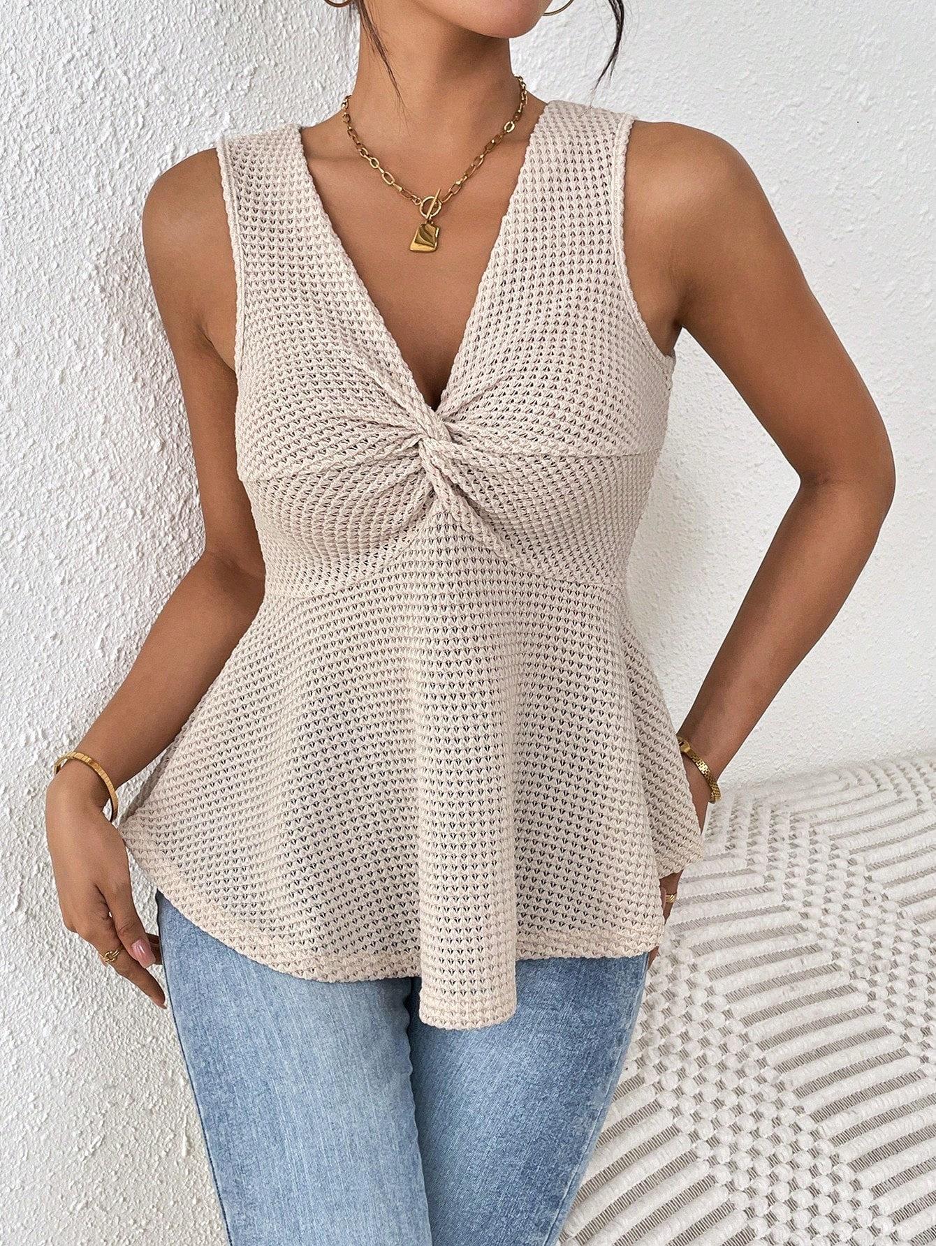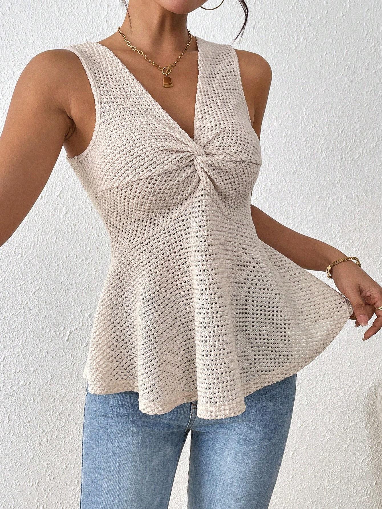 • Women's V Neck Sleeveless Knitted Top Elegant Knot Front Peplum Hem Summer Casual Slim Fit Beige Knit Shirt Blouse For Women