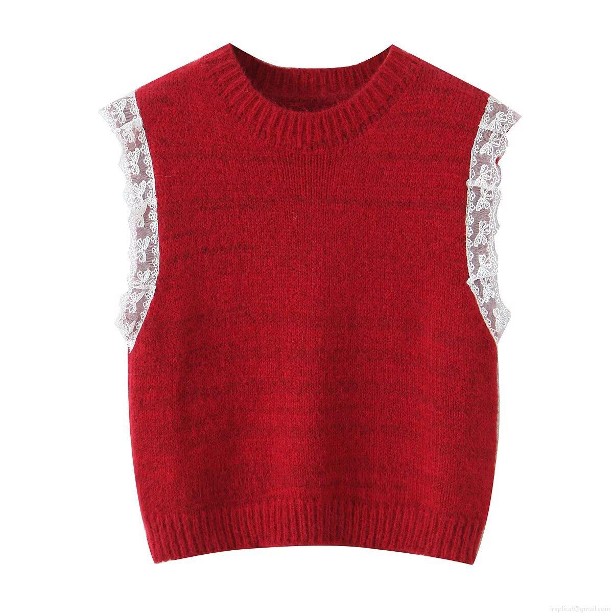 • Women's Vintage Lace Spliced Knitted Sweater Vest Round Neck Sleeveless Polyester Knit Top For Daily Dating Retro Aesthetic Layering Piece