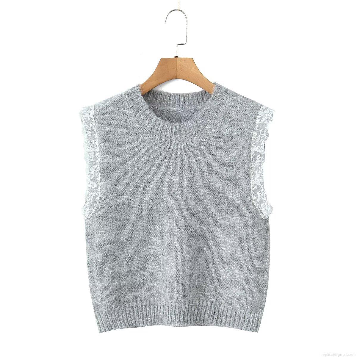 Women's Vintage Lace Spliced Knitted Sweater Vest Round Neck Sleeveless Polyester Knit Top For Daily Dating Retro Aesthetic Layering Piece