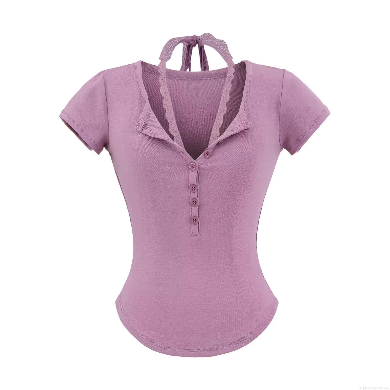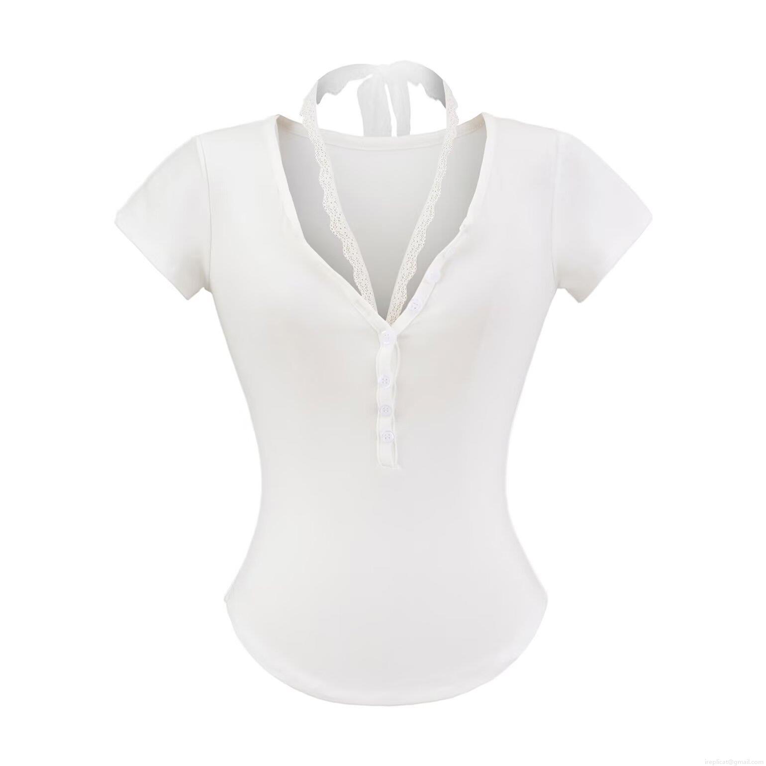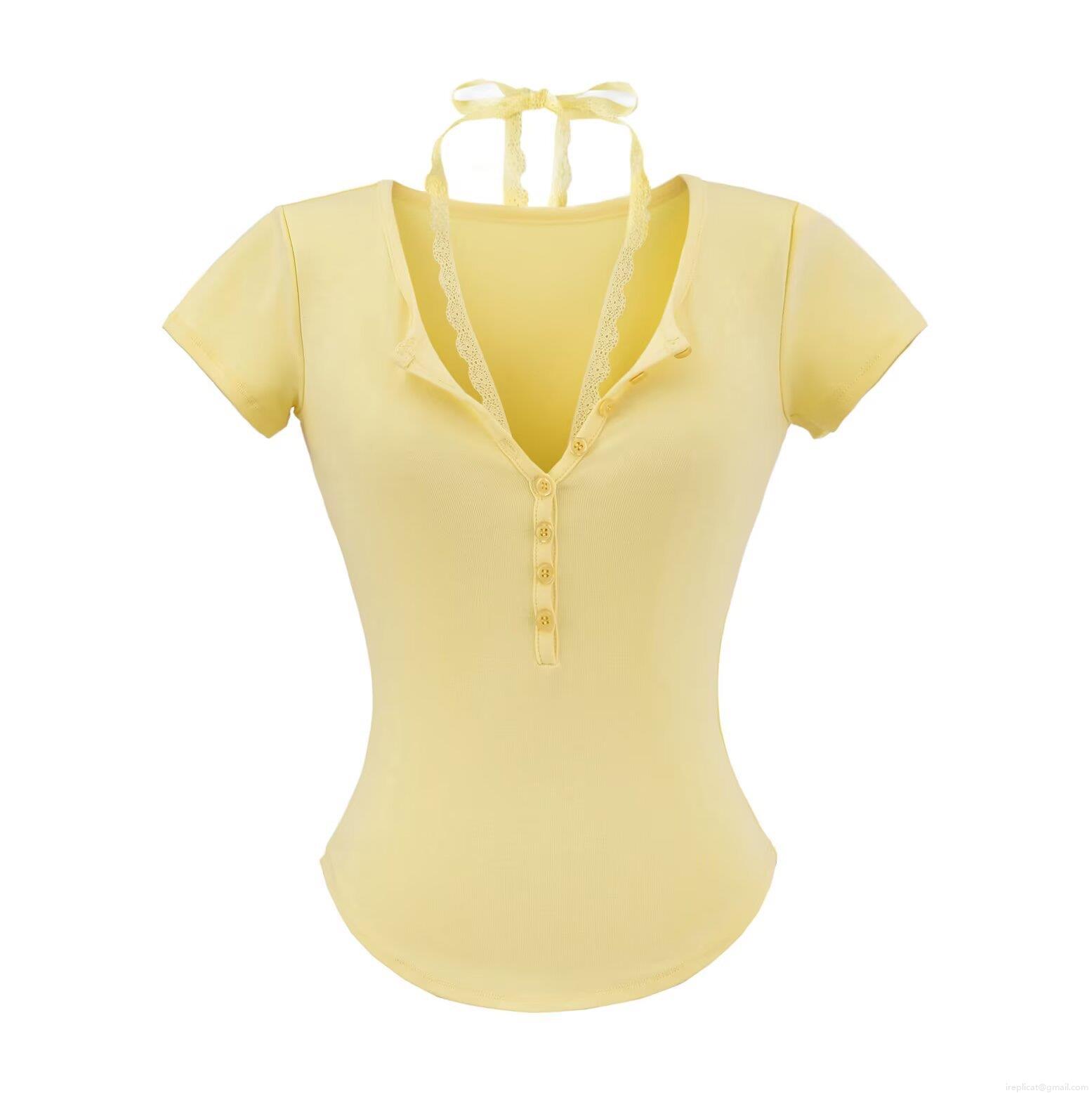 • Women's V-Neck Lace T-Shirt Button Front Back Tie Short Sleeve Slim Fit Ribbed Knit Viscose Elastane Top Sexy Elegant Casual Summer Streetwear Tee