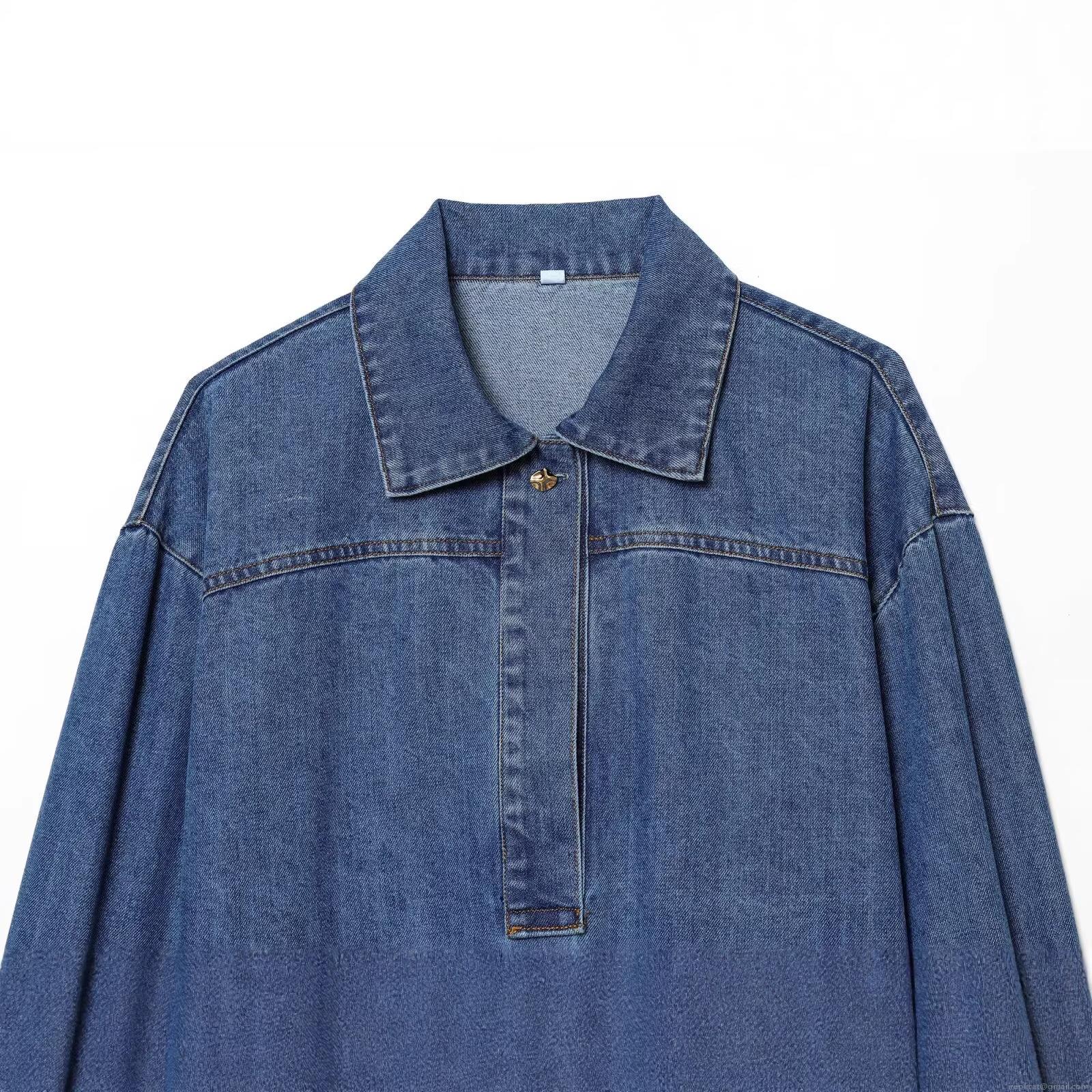 Women's Western Style Loose Denim Shirt Half Button Pullover Lapel Long Sleeve Blue Streetwear Blouse With Metal Button Patchwork Top