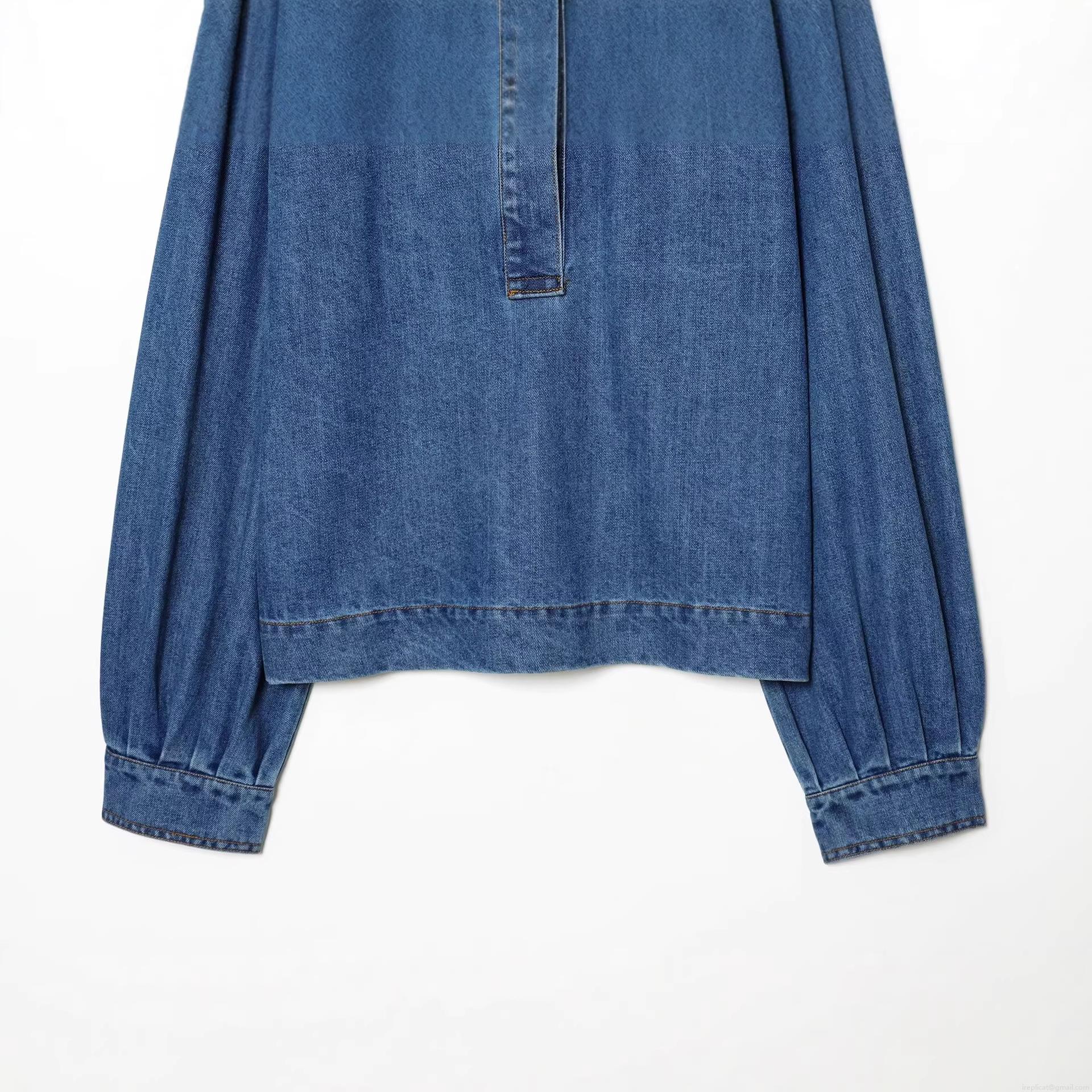 • Women's Western Style Loose Denim Shirt Half Button Pullover Lapel Long Sleeve Blue Streetwear Blouse With Metal Button Patchwork Top