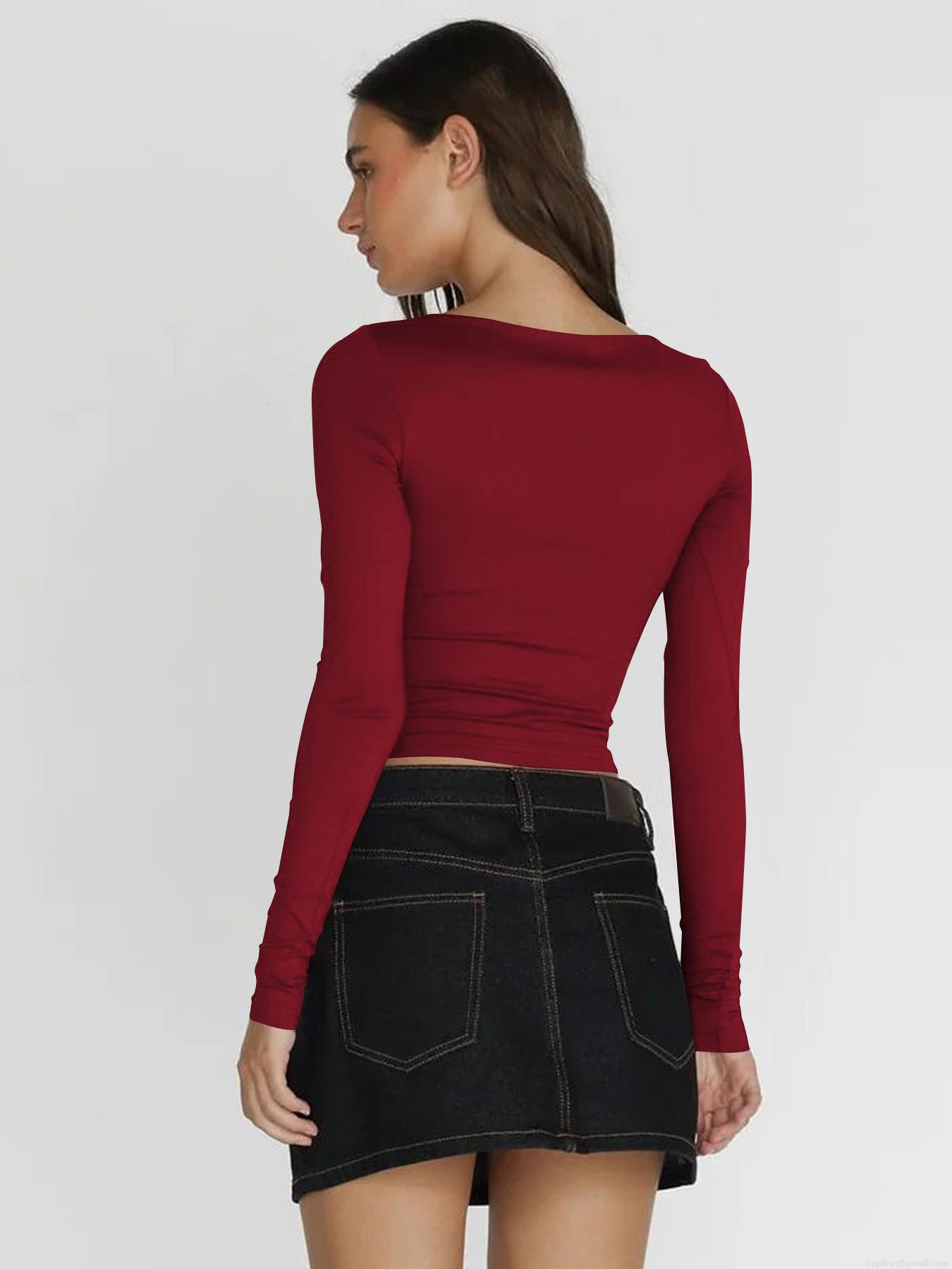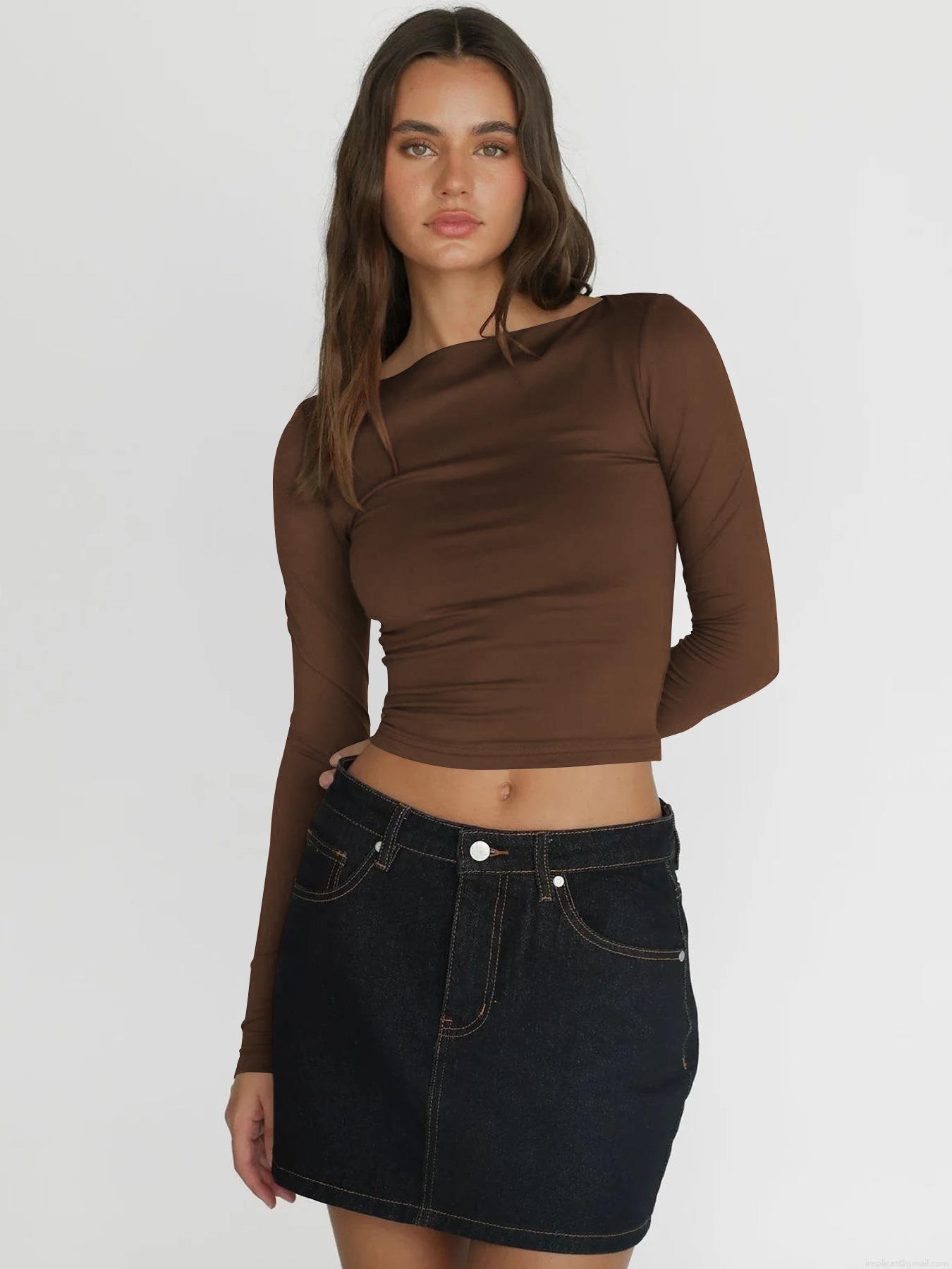 • Women's Y2K Sexy Slim Fit Nylon Knit T-Shirt Long Sleeve Boat Neck Off Shoulder Top Solid Color Streetwear Base Layer Shirt