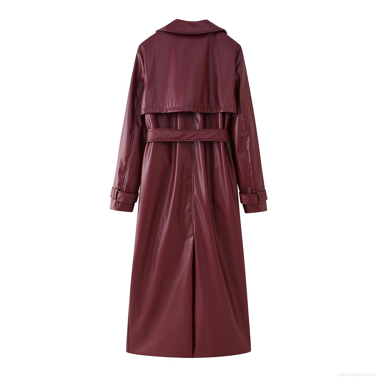 • Women Fashion Winter Long PU Leather Trench Coat With Belt Wine Red Lapel Double Breasted Slim Fit Streetwear Windbreaker Jacket
