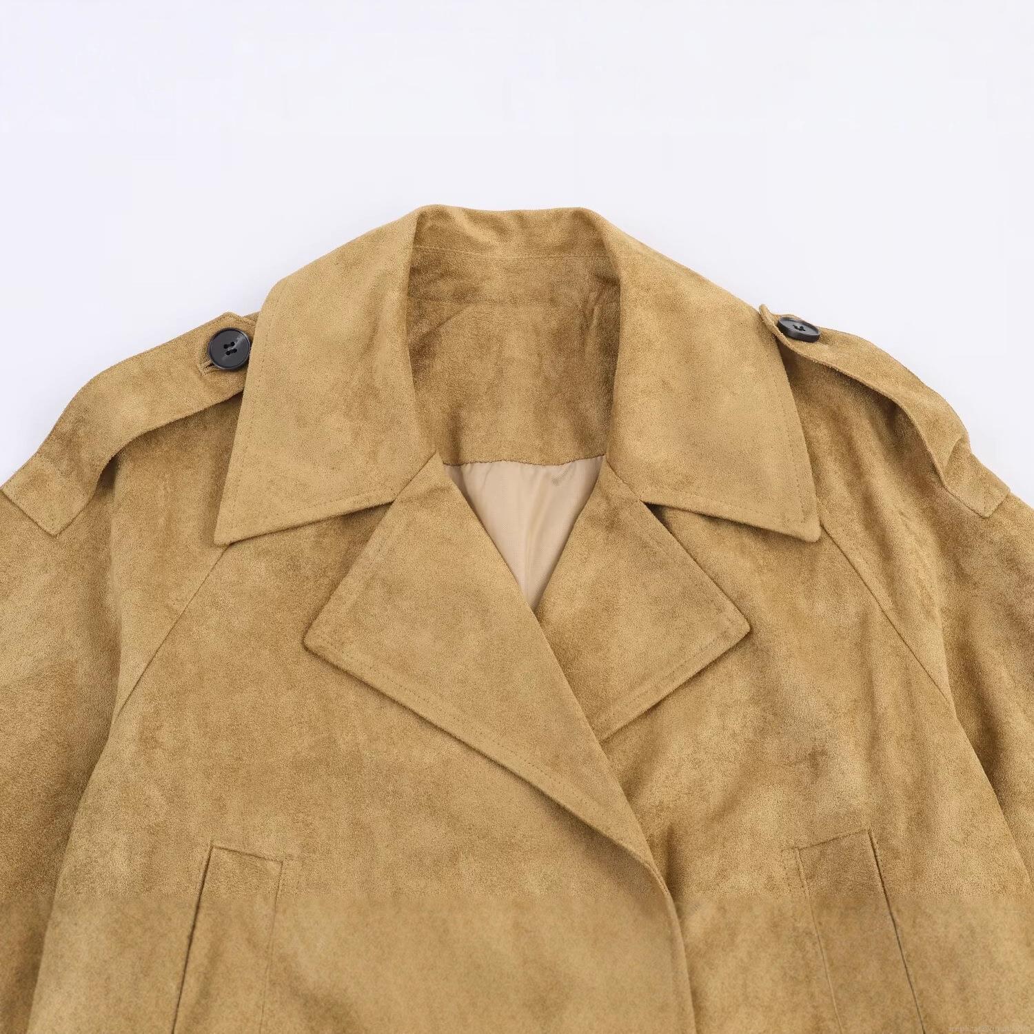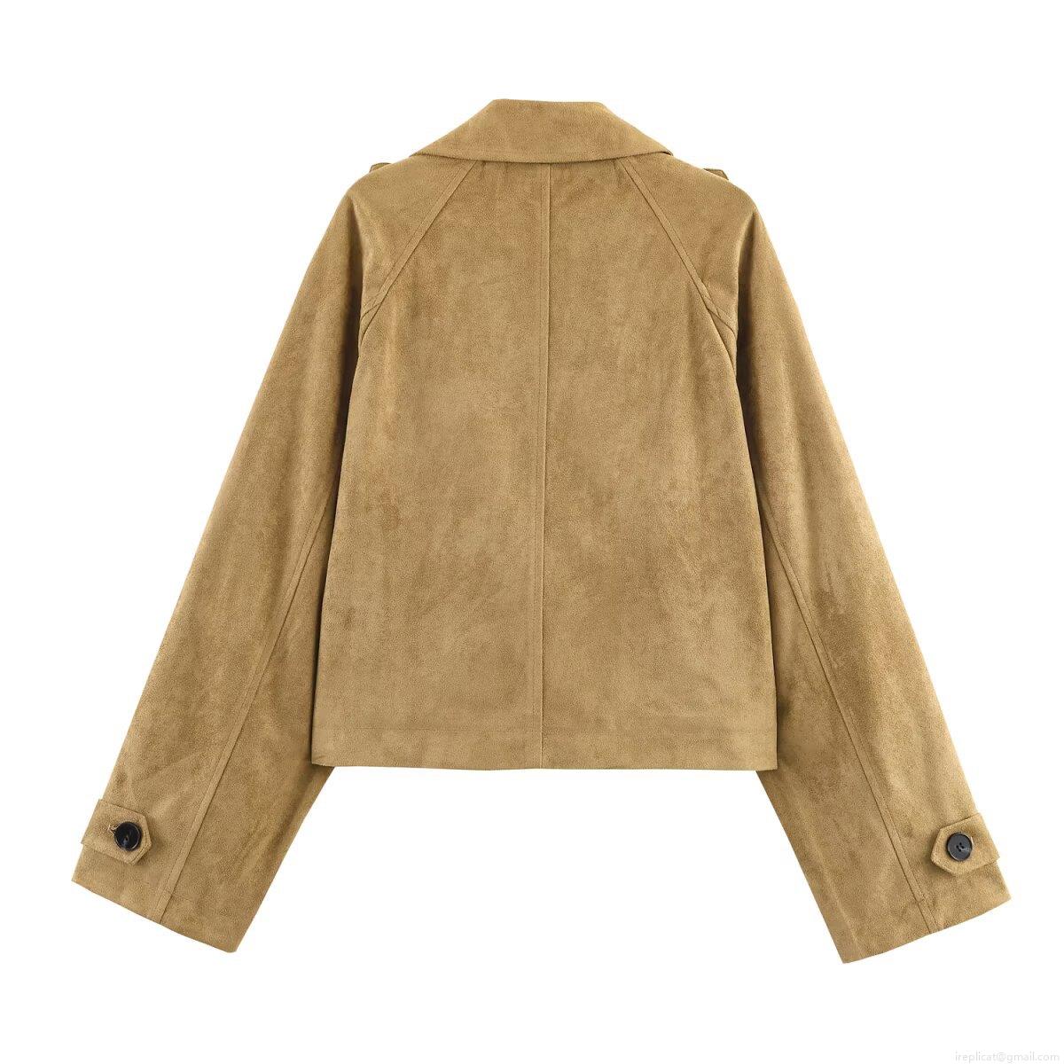 • Women Short Trench Coat Faux Suede Double Breasted Lapel Long Sleeve Jacket With Epaulettes Autumn Casual Streetwear Khaki Windbreaker