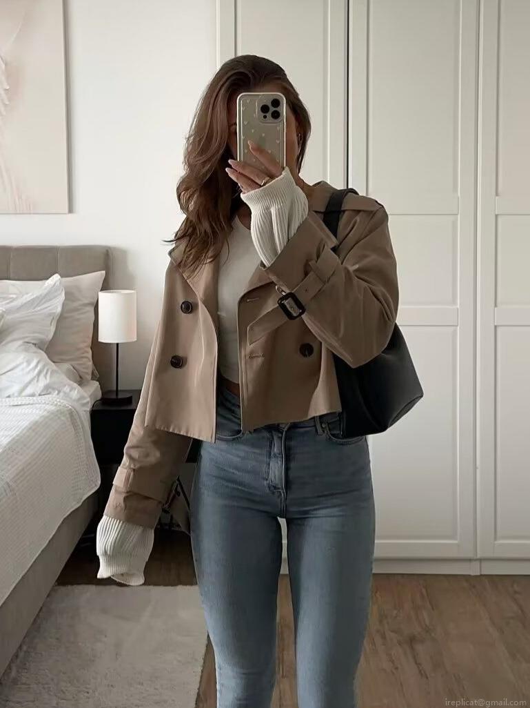 • Women's Autumn Lapel Long Sleeve Double Breasted Short Trench Coat Casual Solid Color Polyester Outerwear Jacket Fashion Western Style Windbreaker