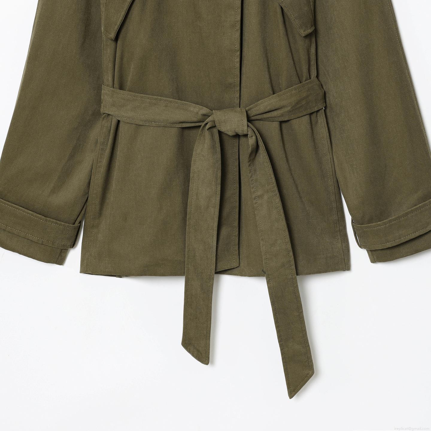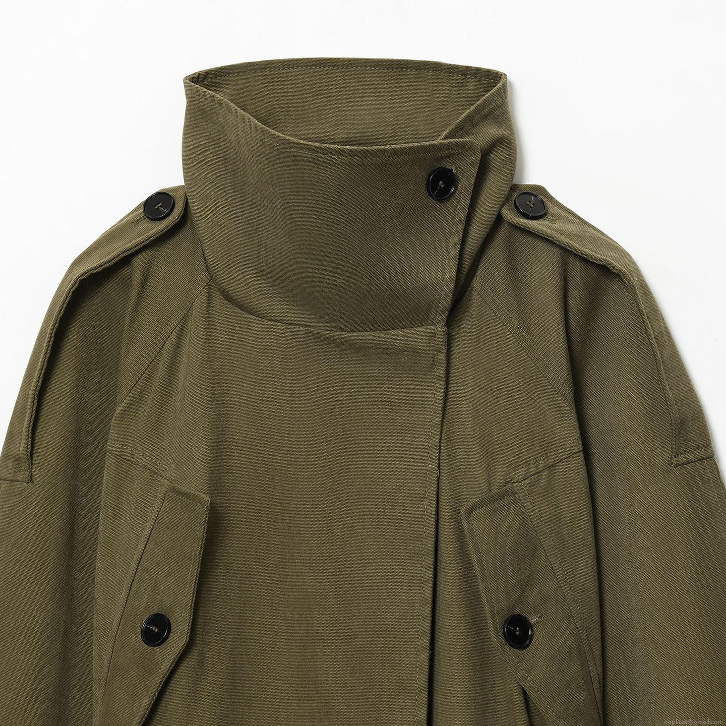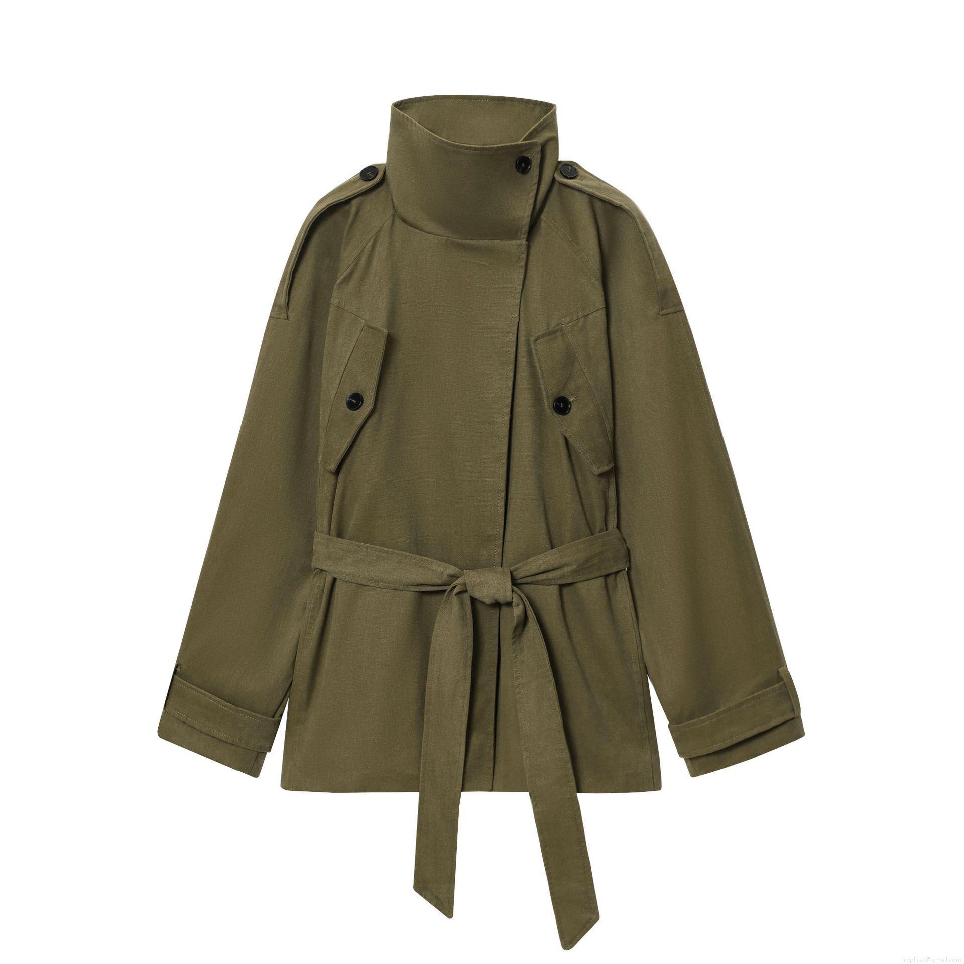 • Women's Casual Army Green Trench Coat With Belt Stand Collar Shoulder Epaulets Single Breasted Mid-Length Polyester Canvas Jacket For Elegant Ladies