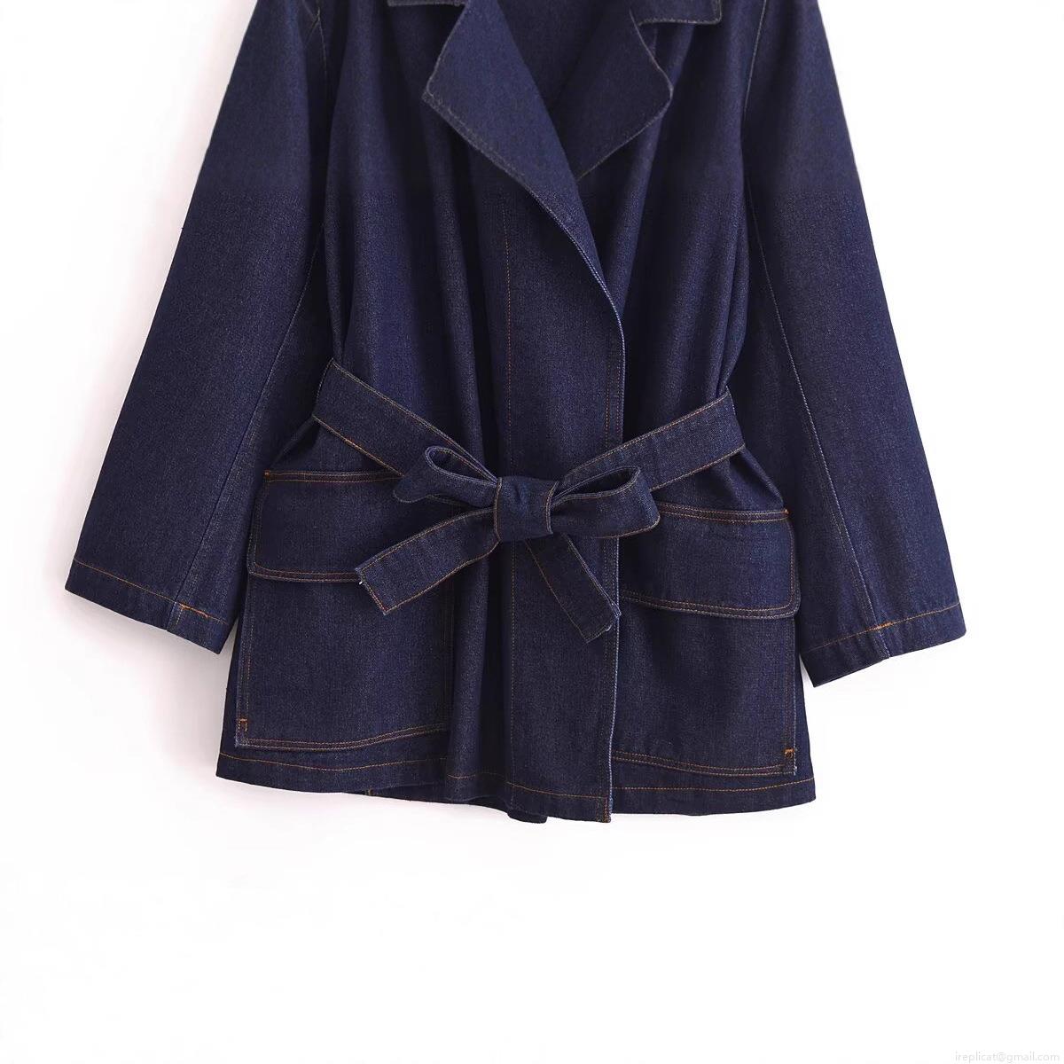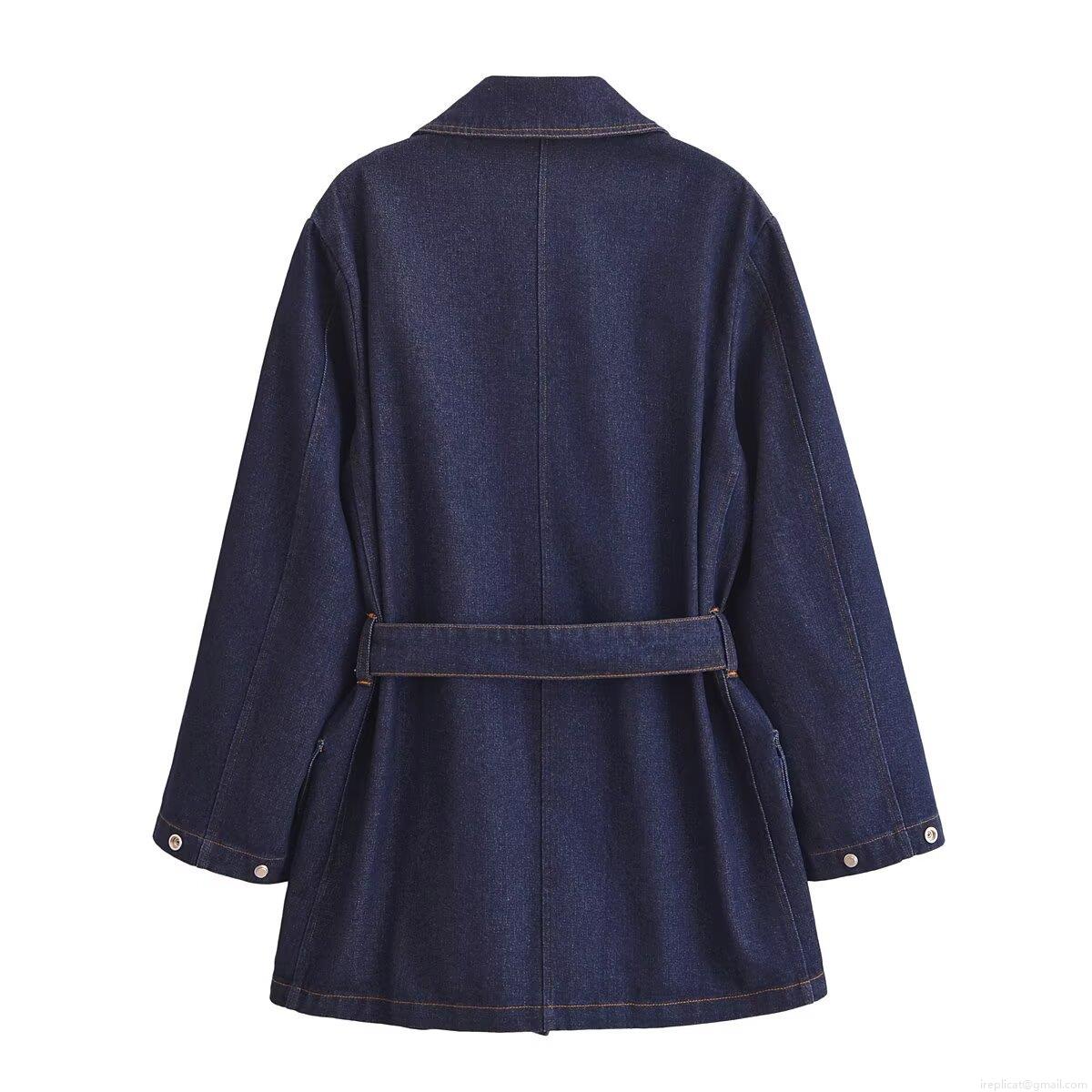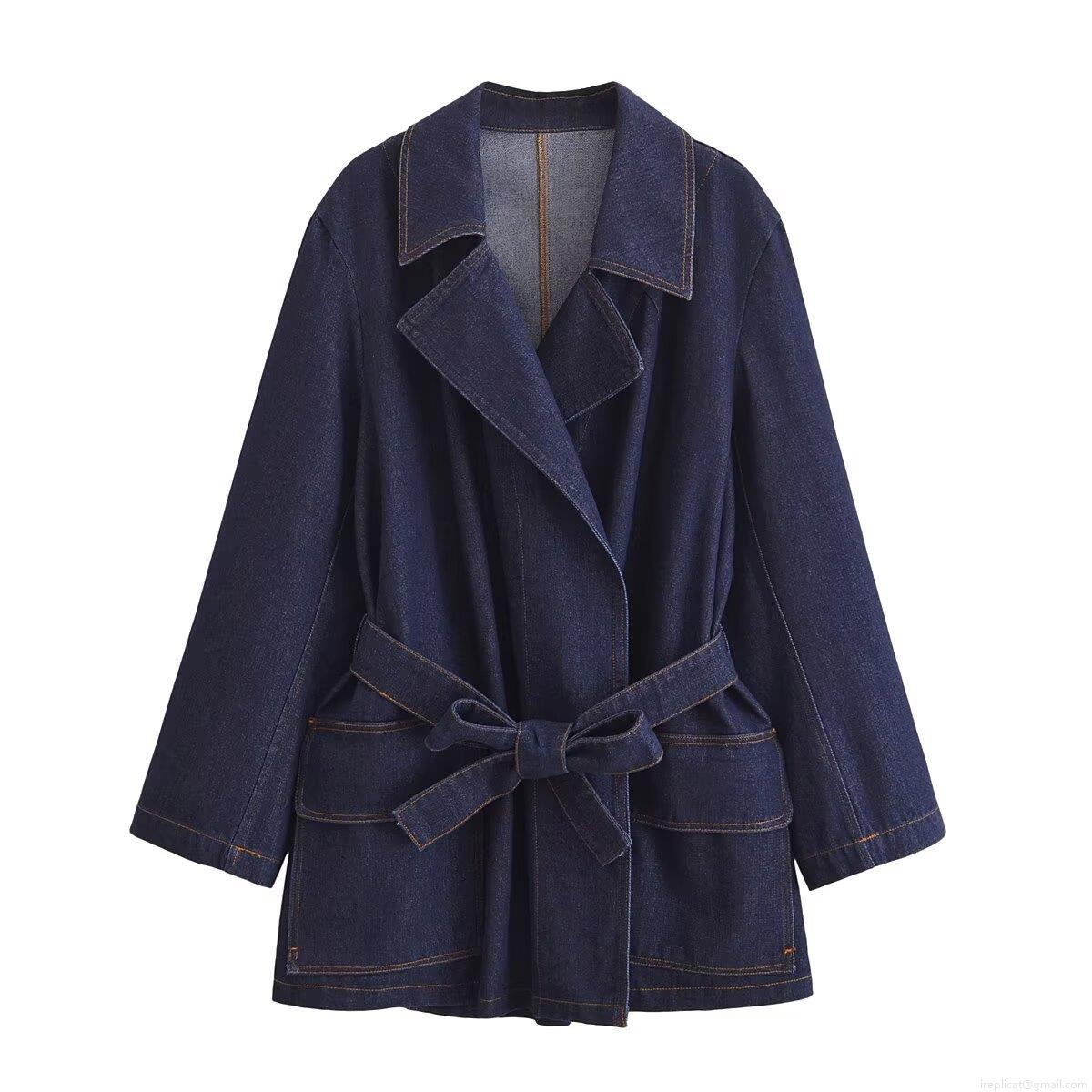 • Women's Deep Blue Denim Trench Coat 100% Cotton Long Sleeve Waist-Tie Belted Lapel Windbreaker With Contrast Stitching Pockets For Autumn Winter Streetwear