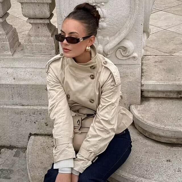 • Women's Double Breasted Short Trench Coat Vintage Lapel Belted Polyester Windbreaker Jacket For Ladies Spring Autumn Casual Outerwear