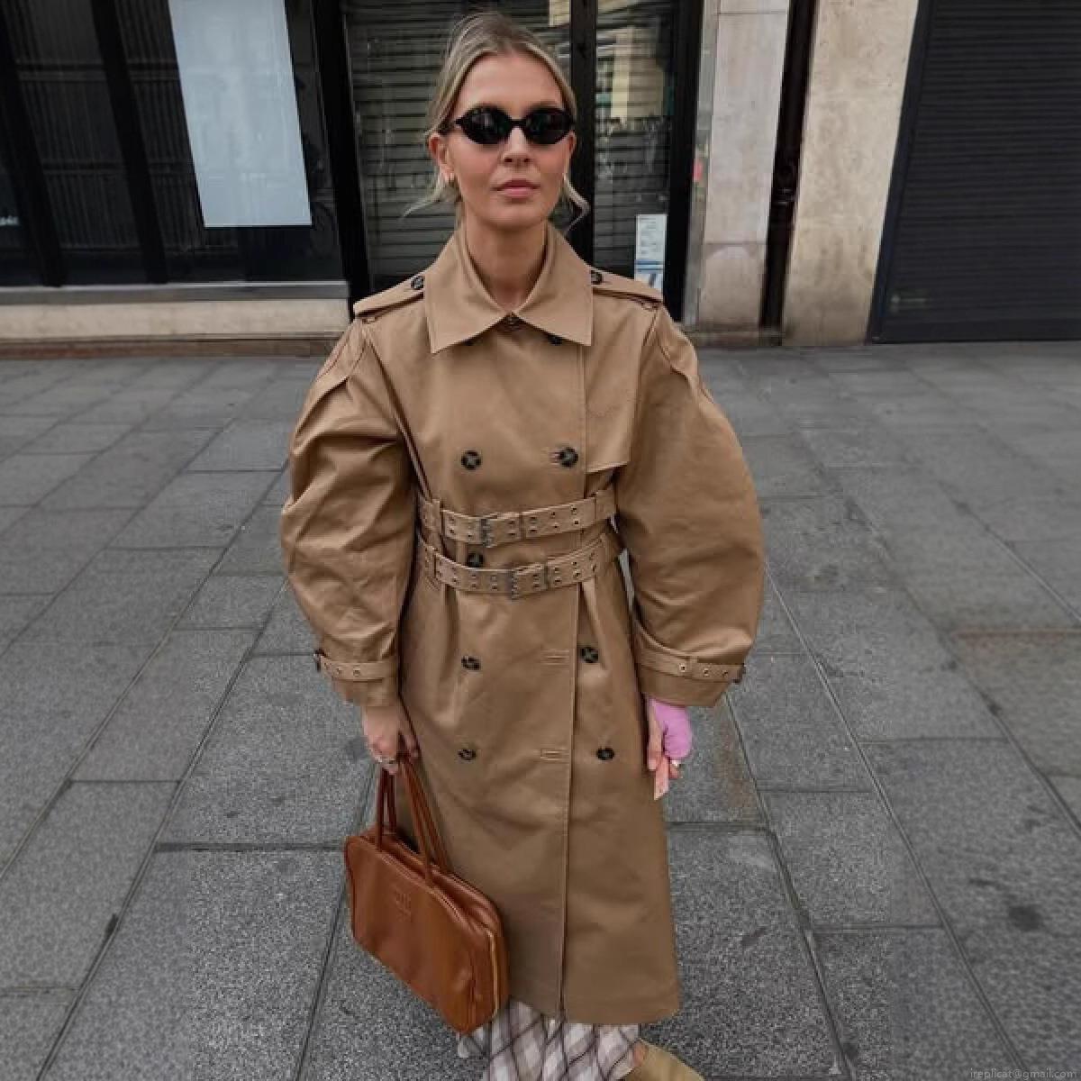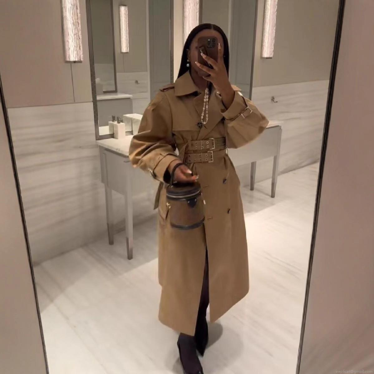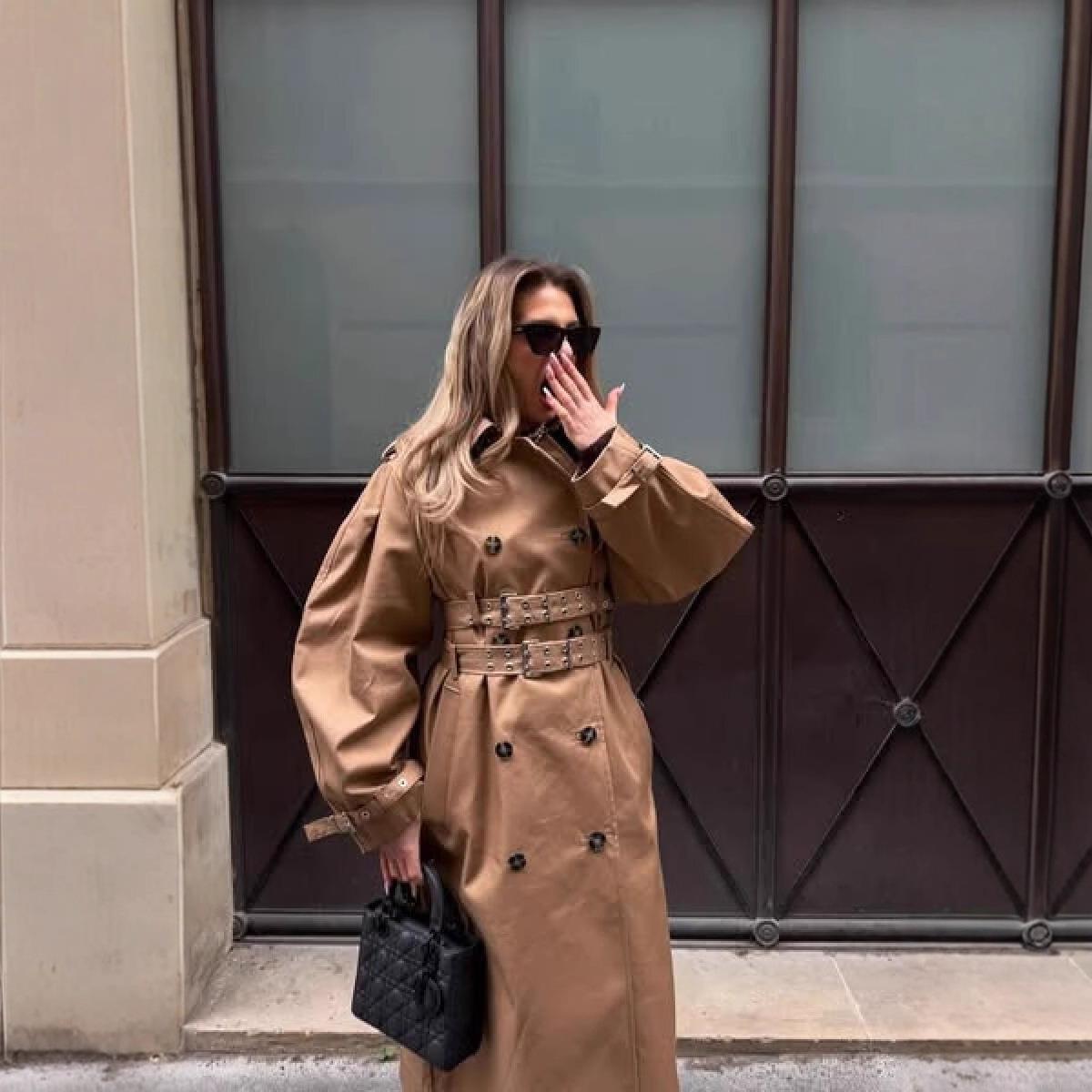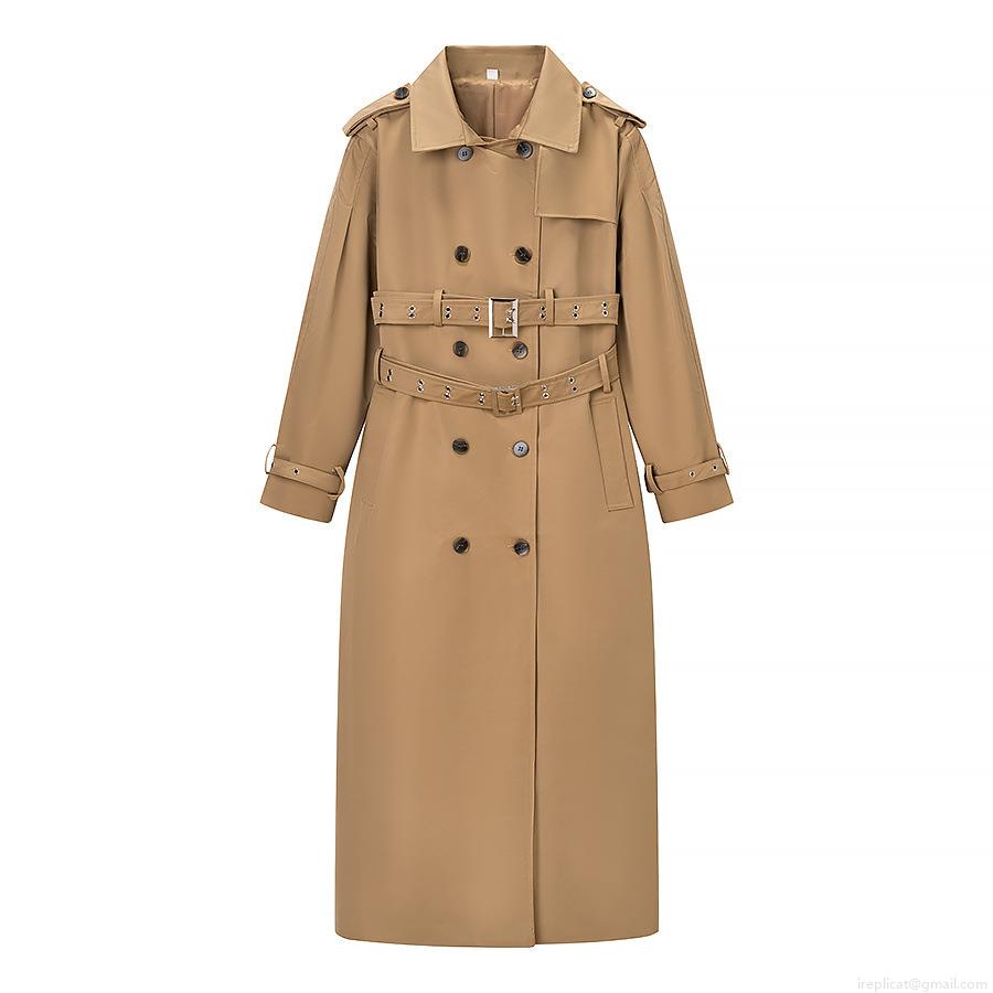 • Women's Double-Breasted Long Trench Coat Khaki Elegant Commuter Overcoat With Double Belt Lantern Sleeves Classic Windproof Polyester Outerwear For Autumn Winter Ladies