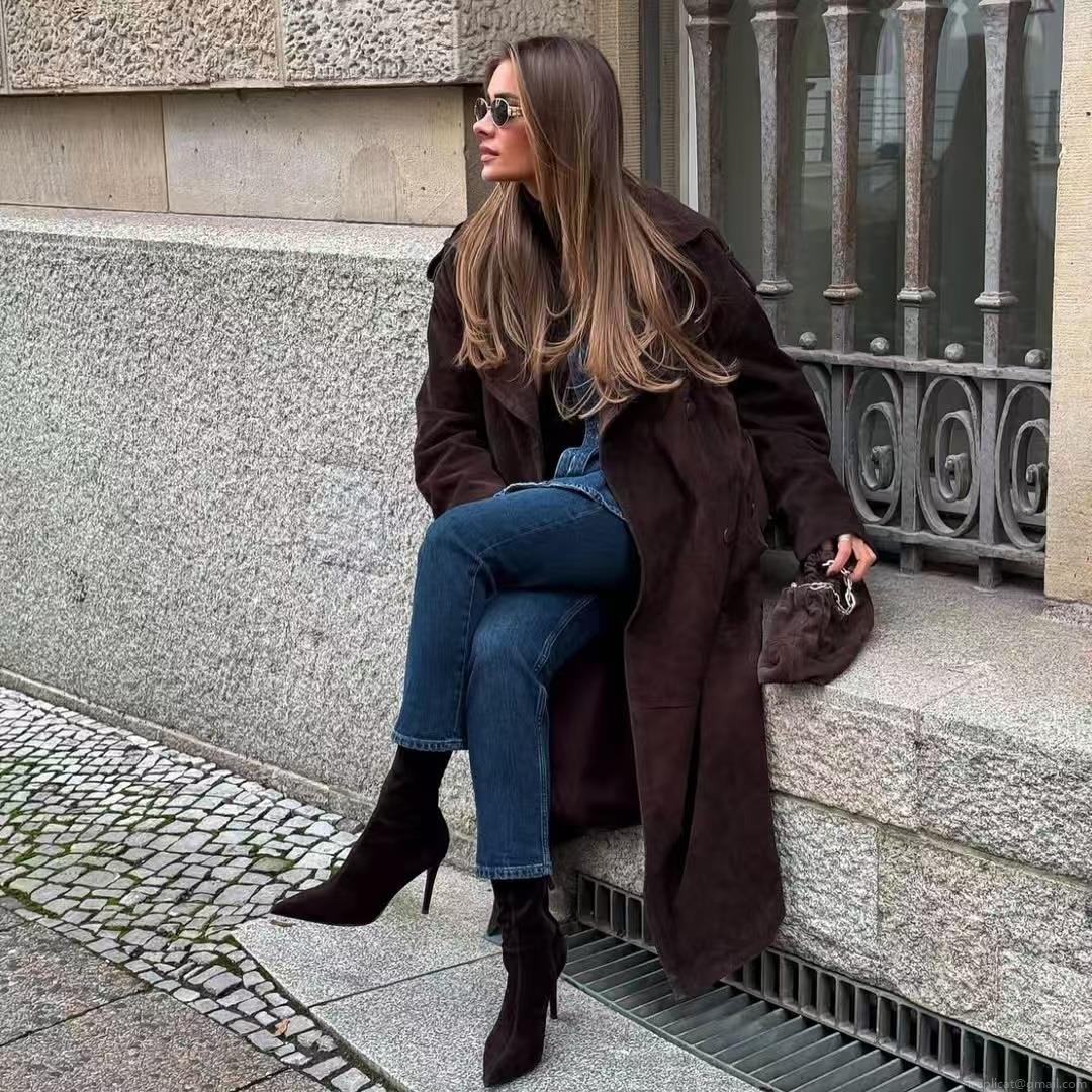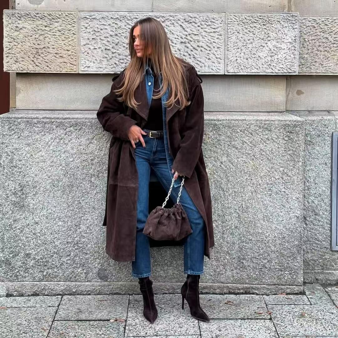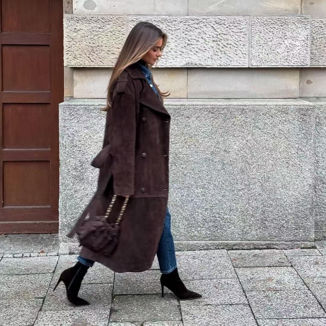• Women's Elegant Long Suede Coat Faux Suede Texture Belted Lapel Trench Coat Fashion Solid Color Outerwear For Autumn Winter Ladies Warm Jacket