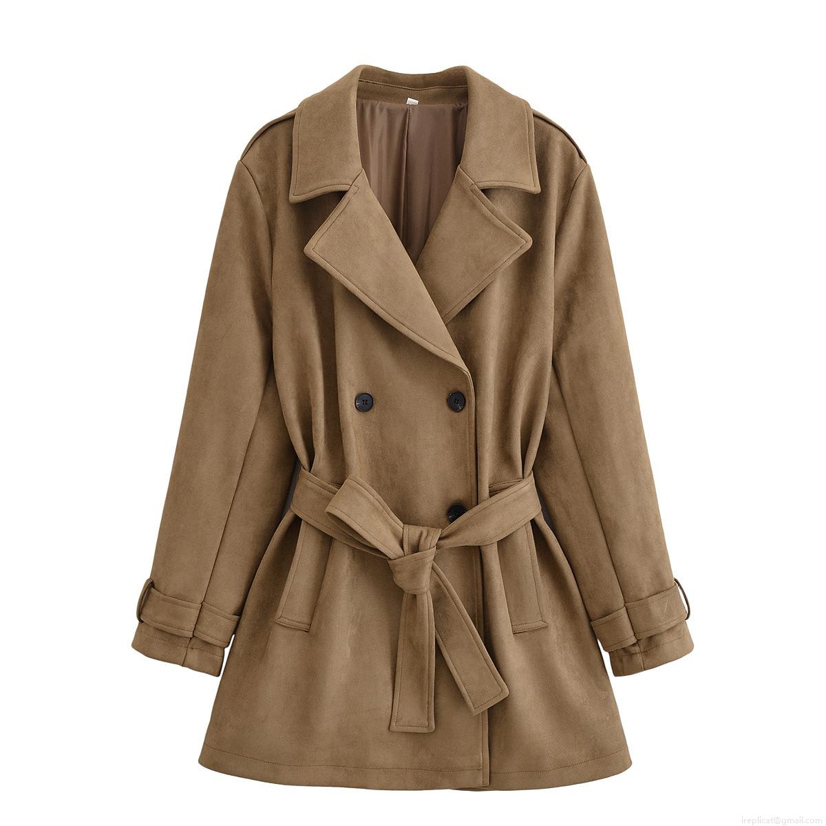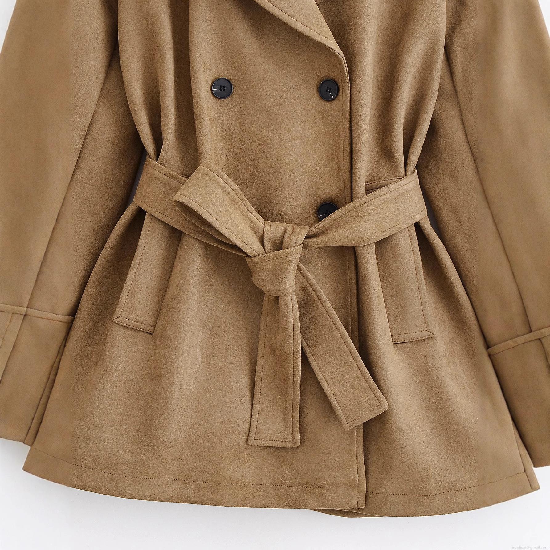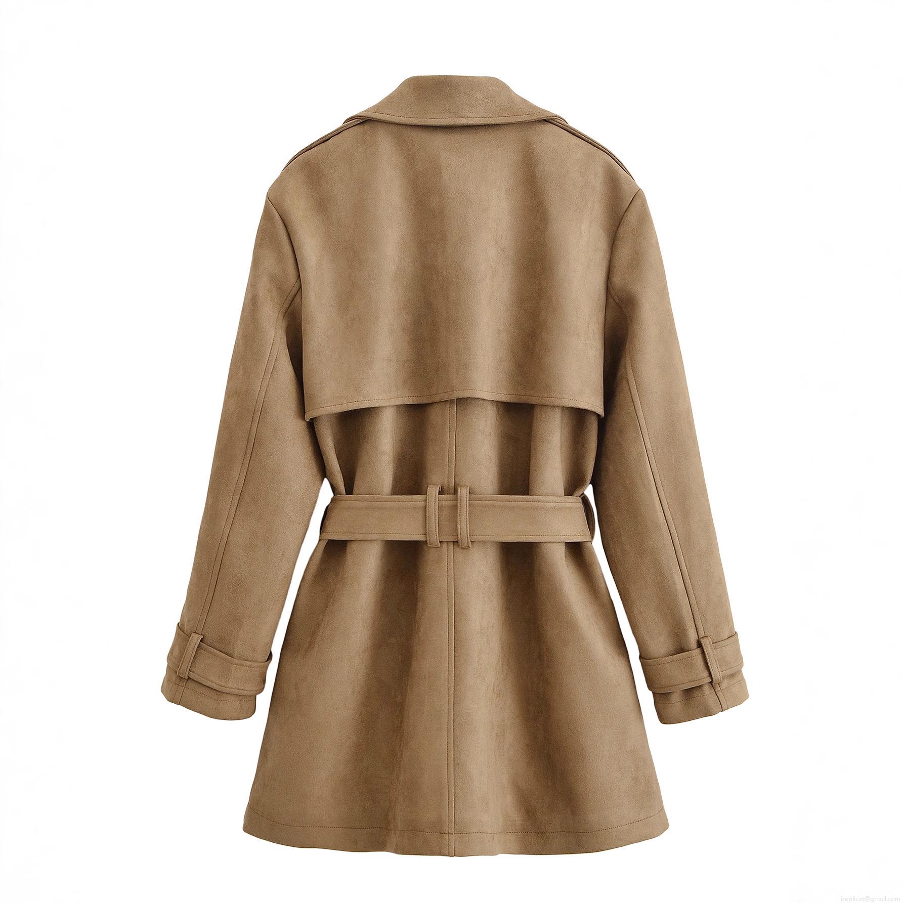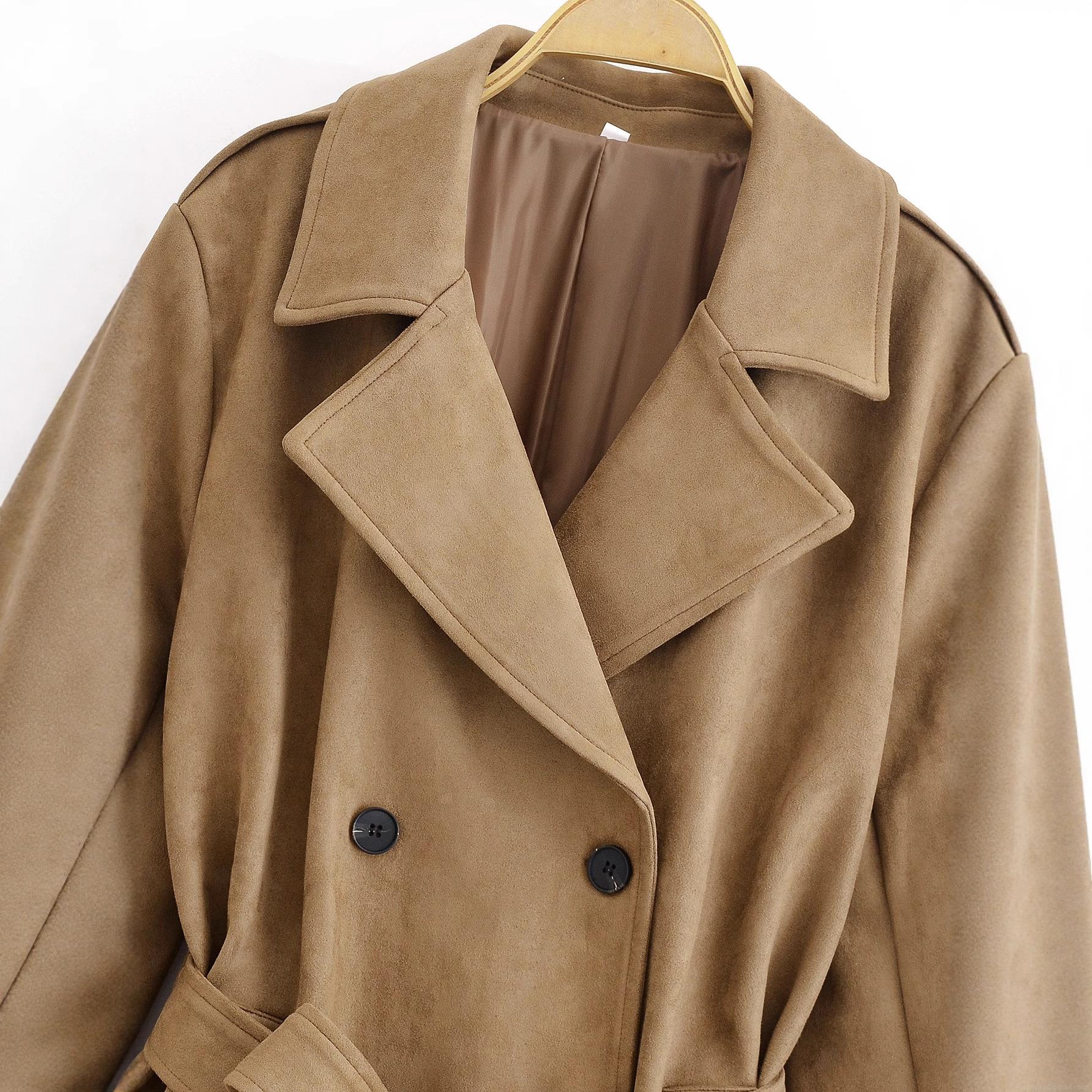 • Women's Elegant Suede Mid-Long Trench Coat Double-Breasted Belted Jacket Autumn Windproof Solid Color Overcoat For Ladies Outdoor Daily Wear