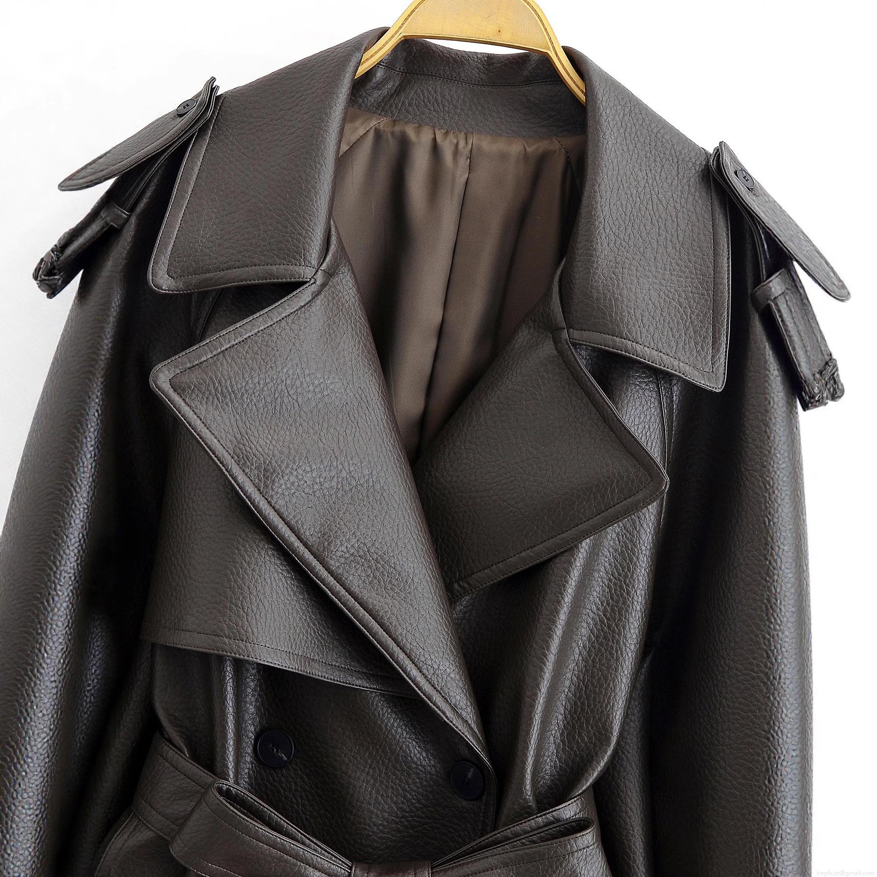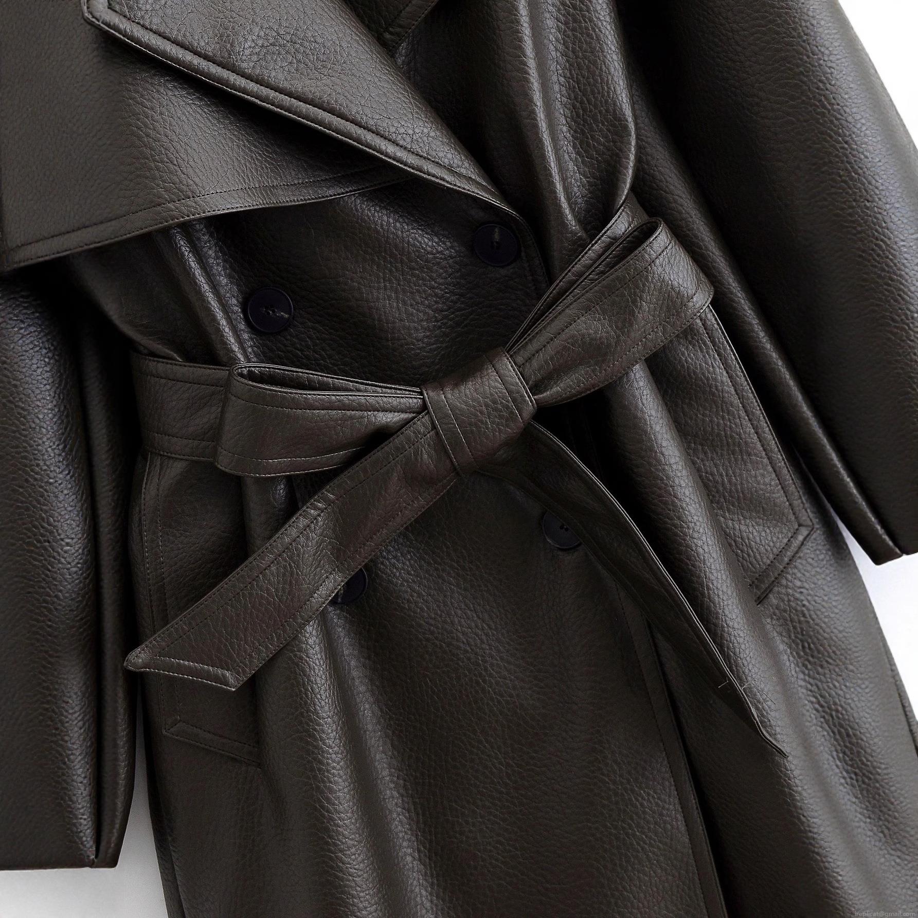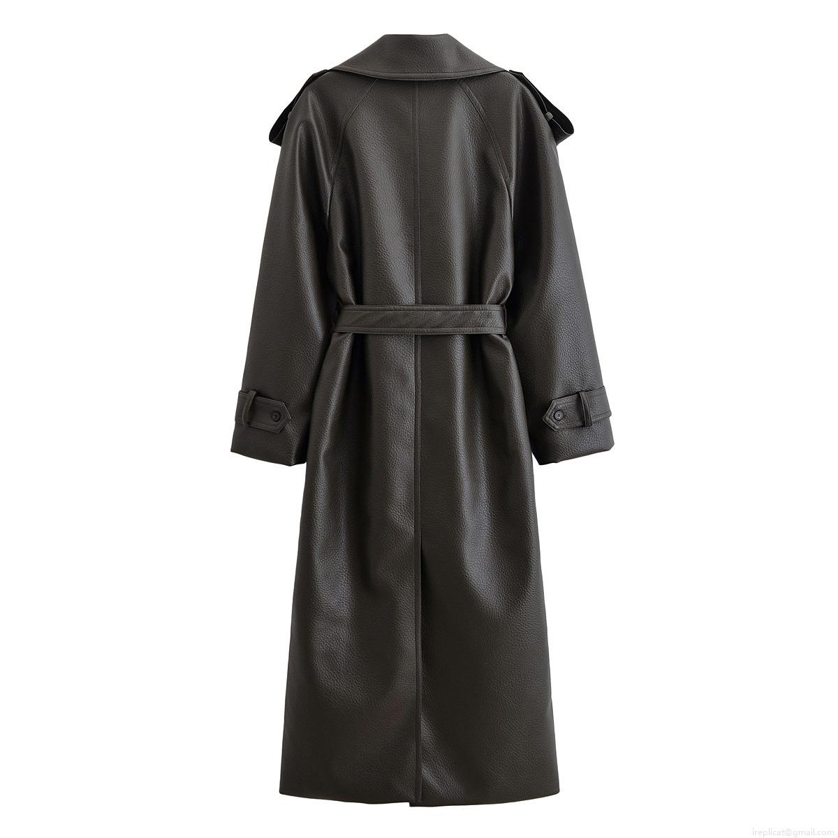 • Women's Extra Long PU Leather Trench Coat Double Breasted Faux Leather Windbreaker With Belt Lychee Texture Solid Color Outerwear For Office Streetwear Fall Winter