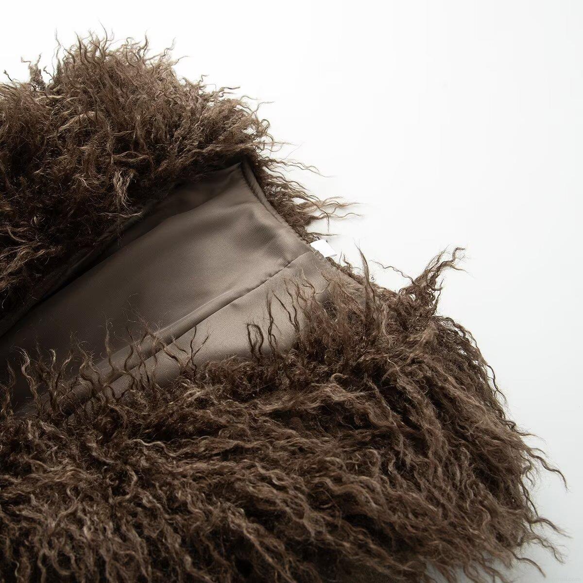 Solid Color, Color Blocking, Double-breasted, Faux Fur Decoration, Large Lapel, Matching Belt