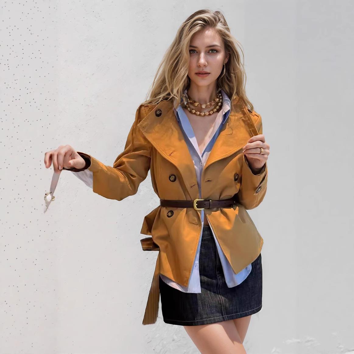 • Women's Fashion Double Breasted Khaki Trench Coat With Striped Scarf Waist Belt Stand Collar Long Sleeve Woven Polyester Mid-Length Outerwear Jacket For Autumn Winter Streetwear