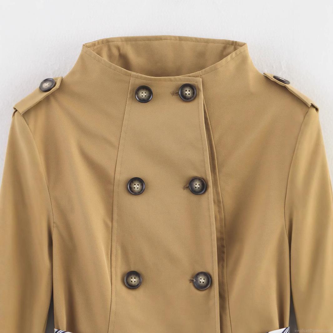 Women's Fashion Double Breasted Khaki Trench Coat With Striped Scarf Waist Belt Stand Collar Long Sleeve Woven Polyester Mid-Length Outerwear Jacket For Autumn Winter Streetwear