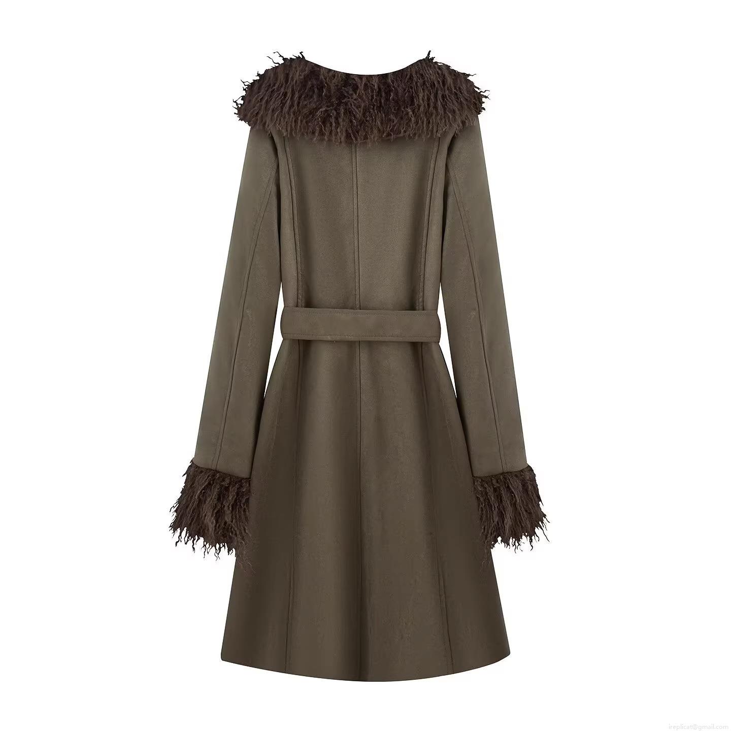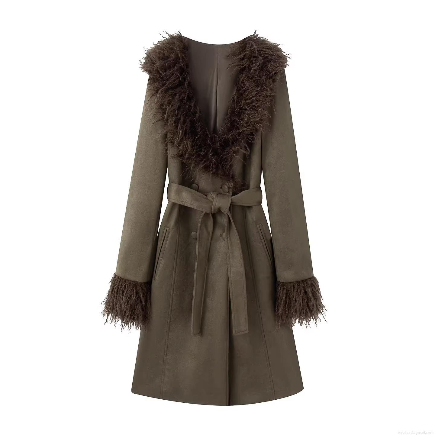 • Women's Faux Suede Trench Coat With Faux Fur Collar And Cuffs Double Breasted Belted Long Sleeve Warm Outerwear For Autumn Winter Ladies Casual Elegant Overcoat