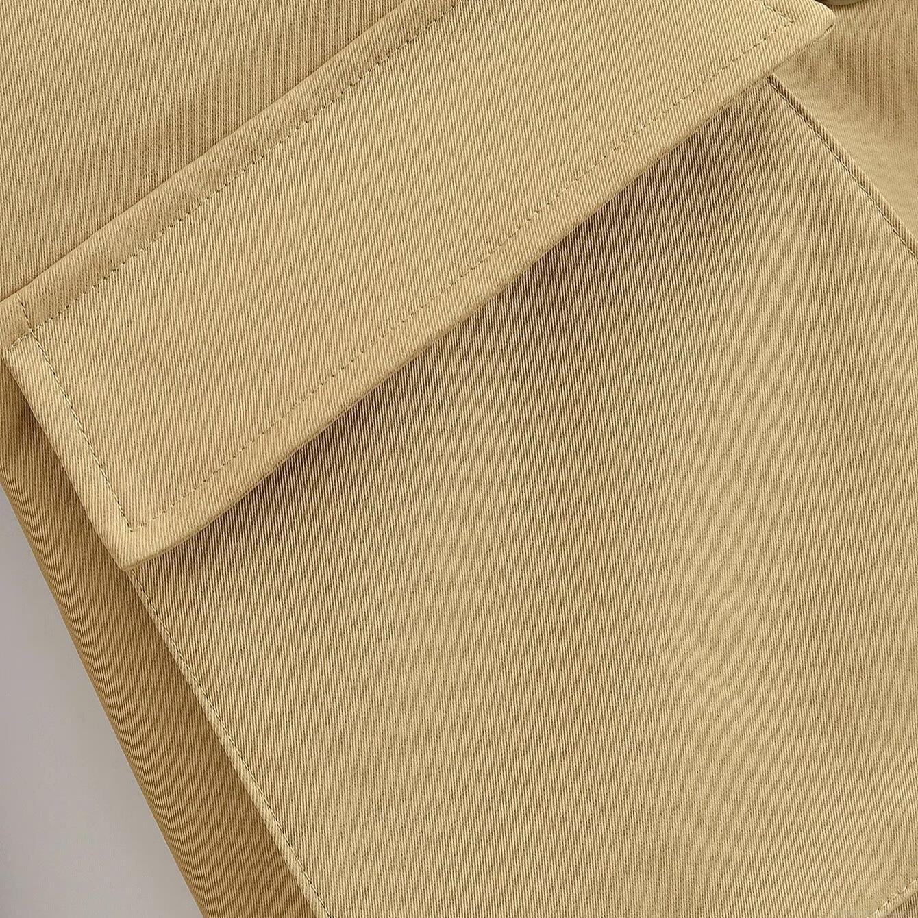 Women's Khaki Polyester Stand Collar Windbreaker Jacket Single Breasted Multi-Pocket Streetwear Autumn Outerwear With Epaulets And Cuff Straps