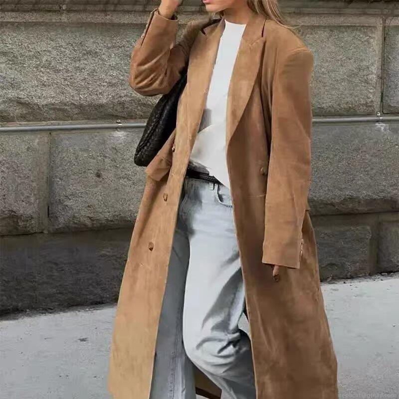 • Women's Long Faux Suede Trench Coat Vintage British Style Double Breasted Suit Collar Loose Overcoat Warm Windproof Jacket For Women Streetwear