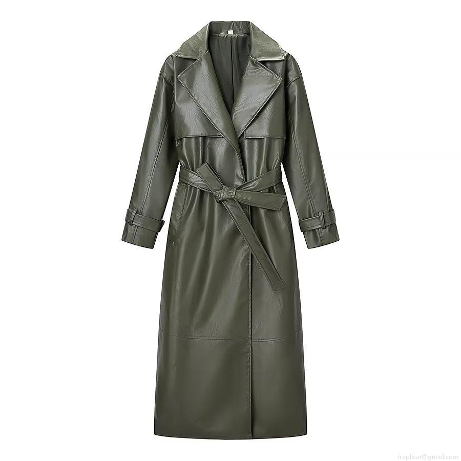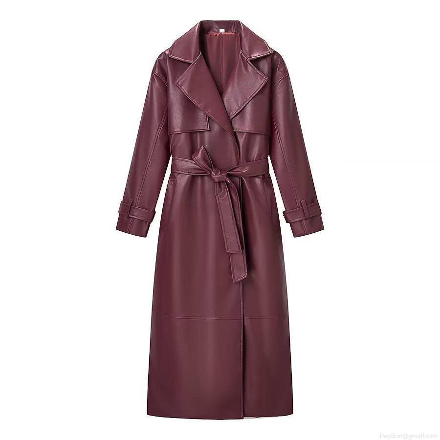 Women's Long PU Leather Trench Coat With Belt Lapel Double Breasted Casual Fashion Windbreaker Jacket Wine Red Army Green Autumn Winter Outerwear