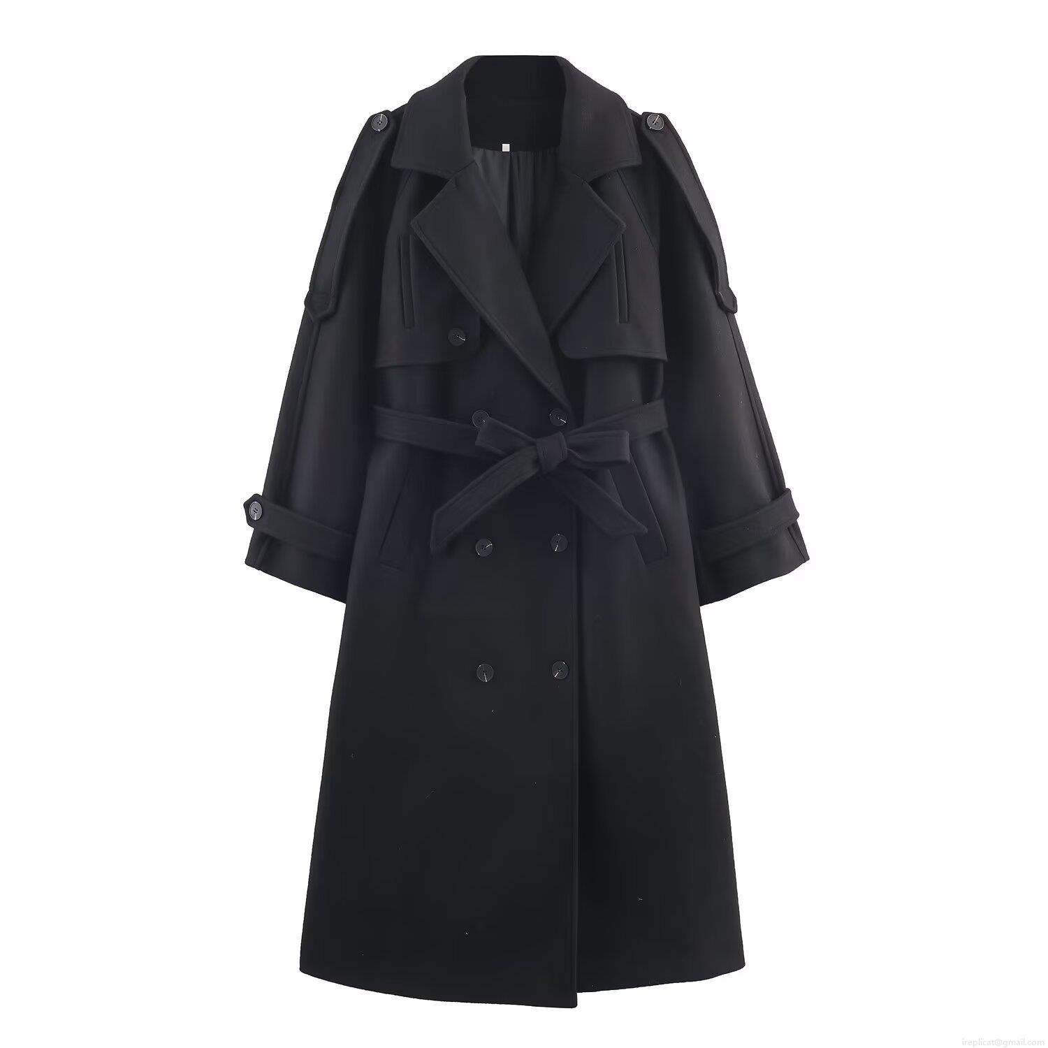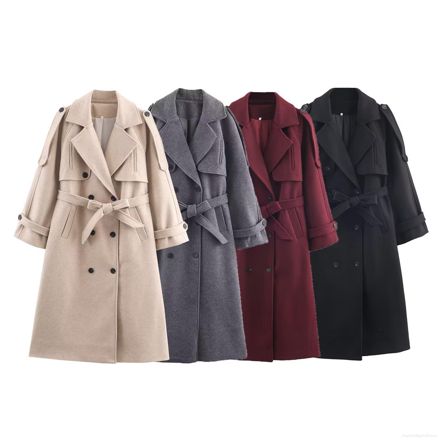 Women's Long Woolen Coat With Belt Double Breasted Trench Coat Large Lapel Jacket Outerwear For Winter Autumn Streetwear Elegant Ladies Windbreaker