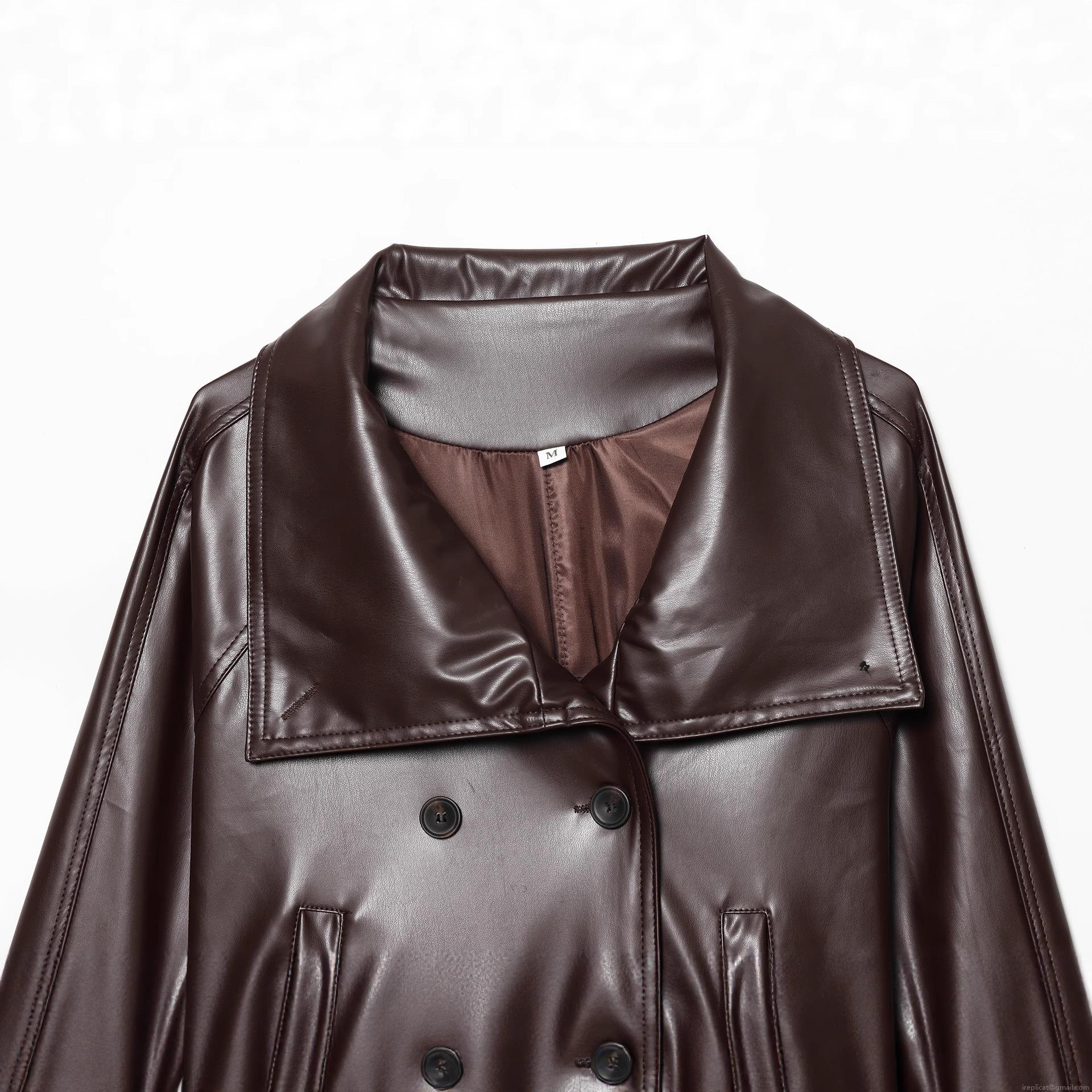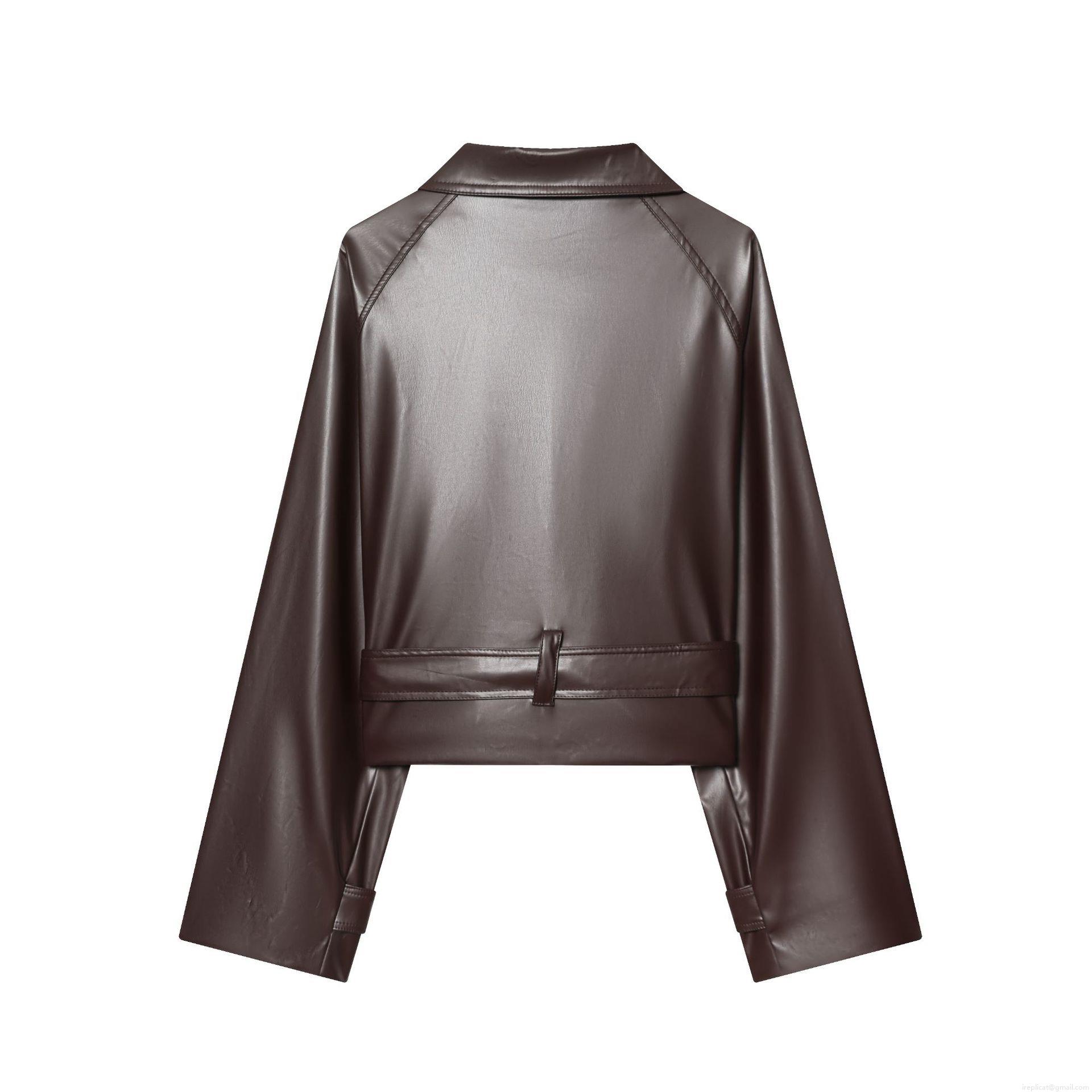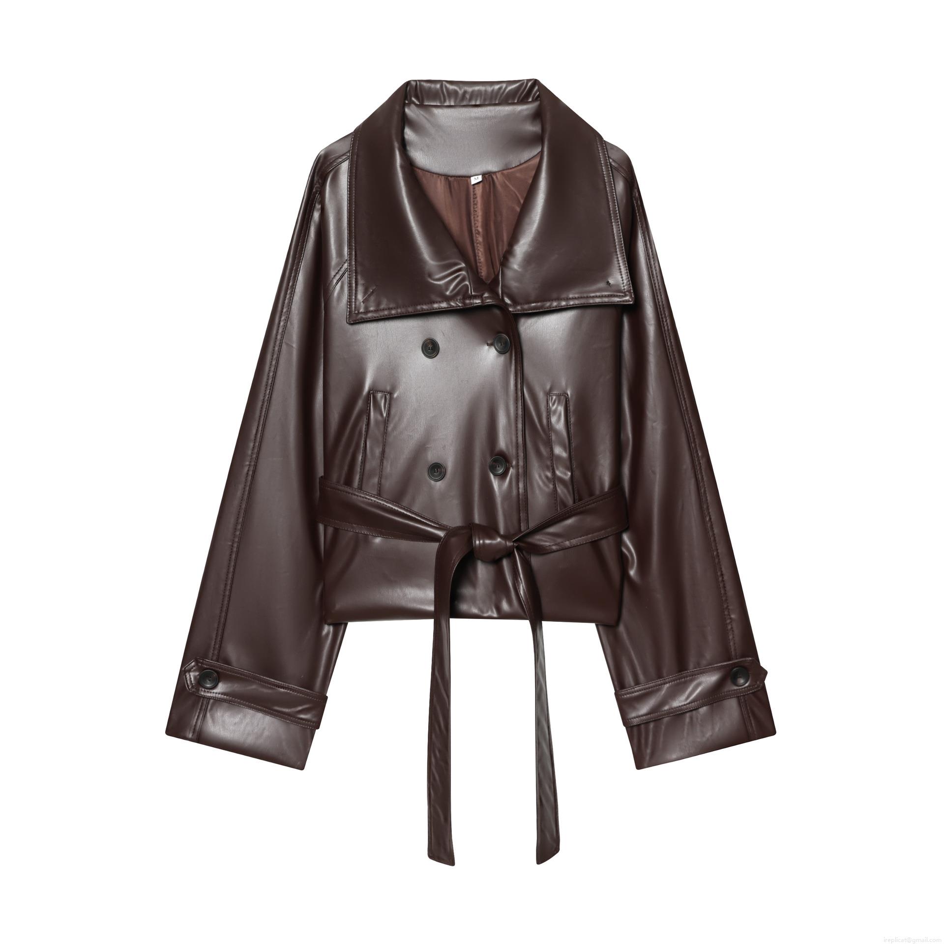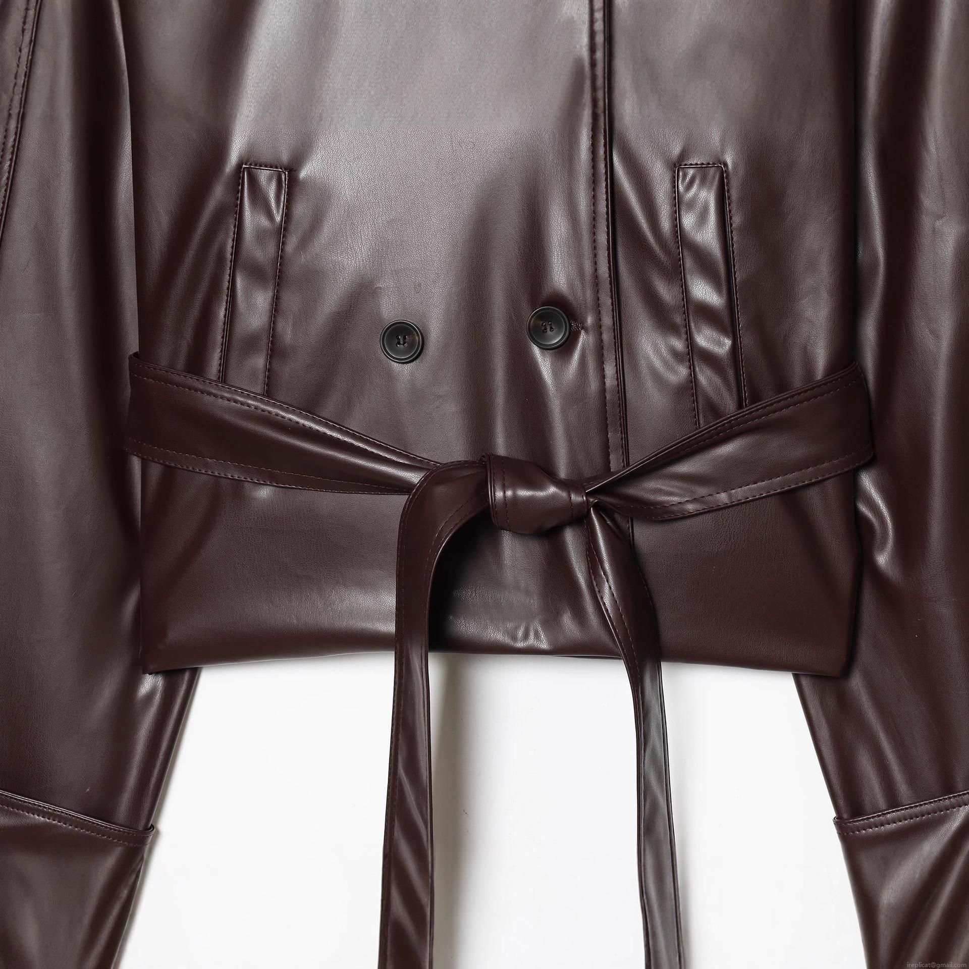 • Women's Short Faux Leather Trench Coat With Belt Double-Breasted Lapel Long Sleeve PU Leather Jacket Urban Casual Solid Color Outerwear For Fall Winter