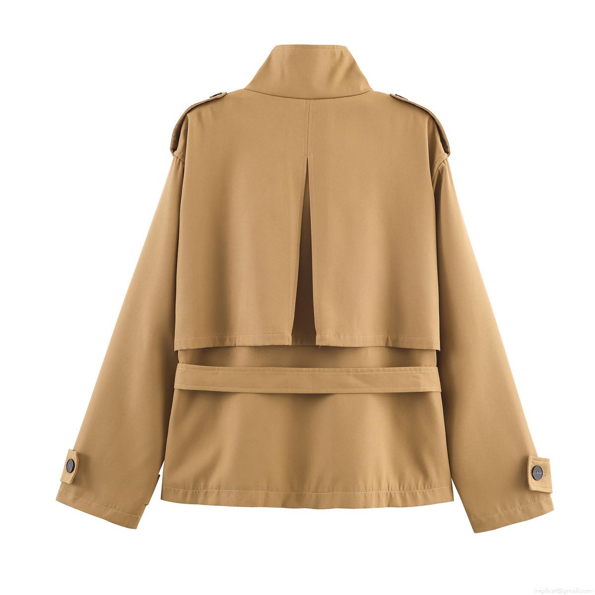 Women's Short Khaki Trench Coat Jacket 100% Polyester Windproof Fall Outerwear With Waist Belt And Epaulets Casual Workwear Style
