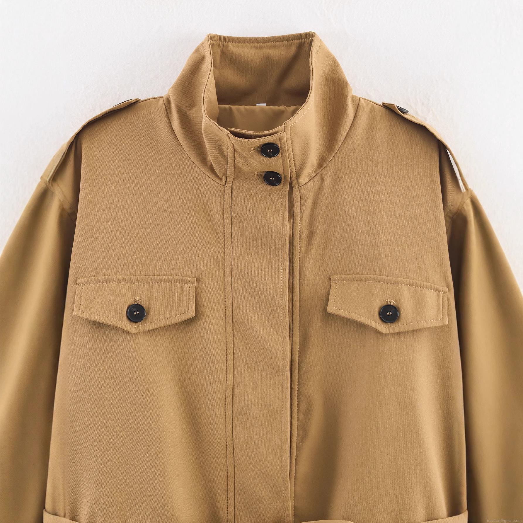 Solid Color, Lace, Shoulder Epaulettes, Stand-up Collar, Multiple Pockets, Decorative Belt