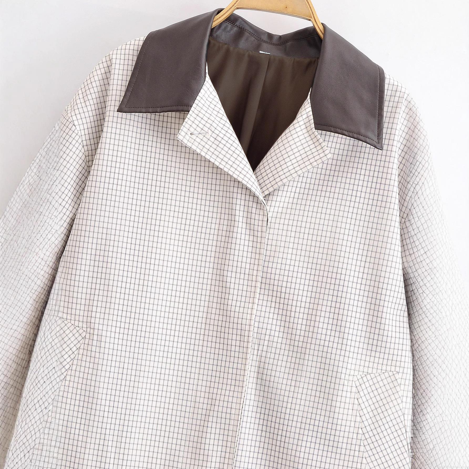 • Women's Short Plaid Trench Jacket With PU Leather Lapel Collar Casual Commuting Black White Check Pattern Button Up Outwear For Ladies