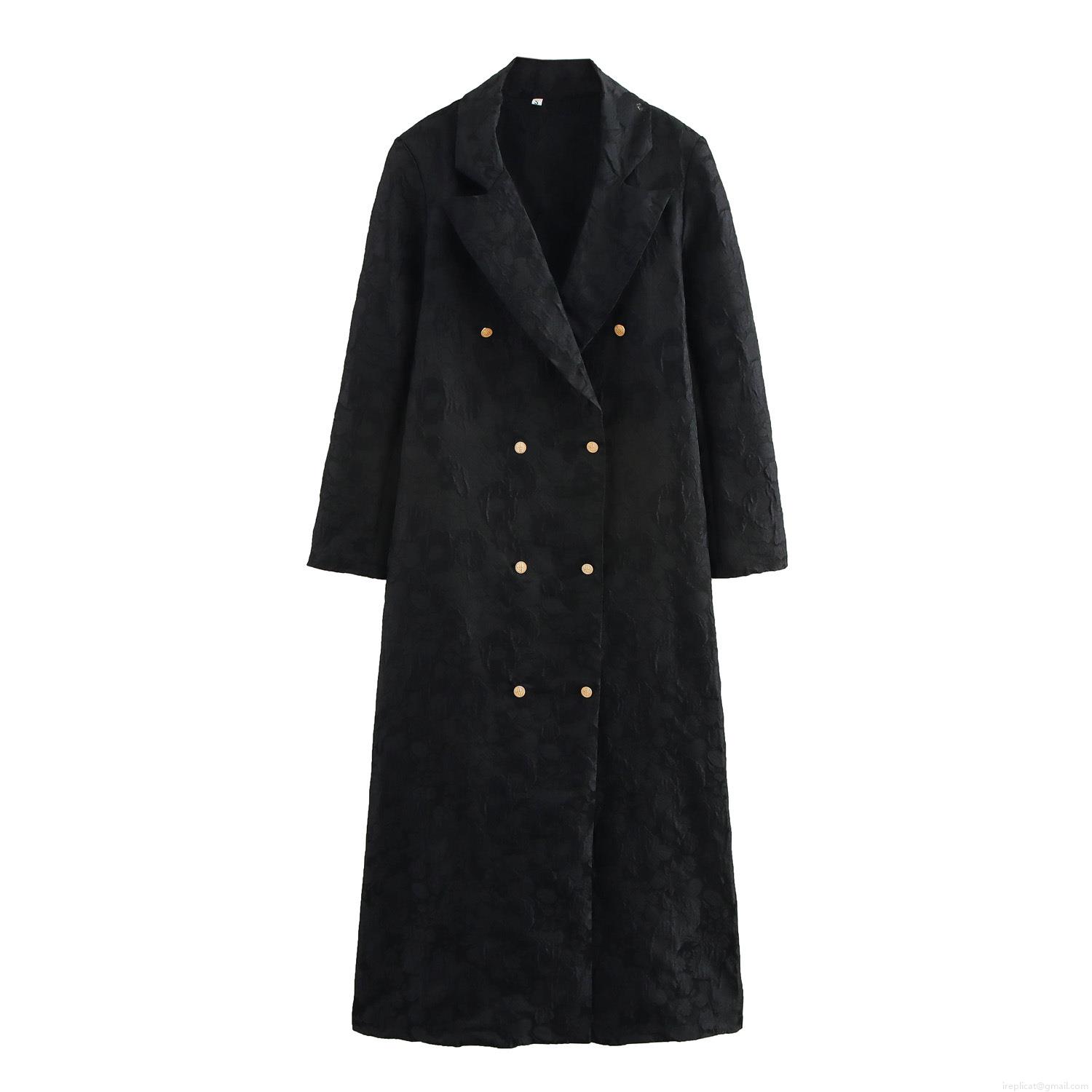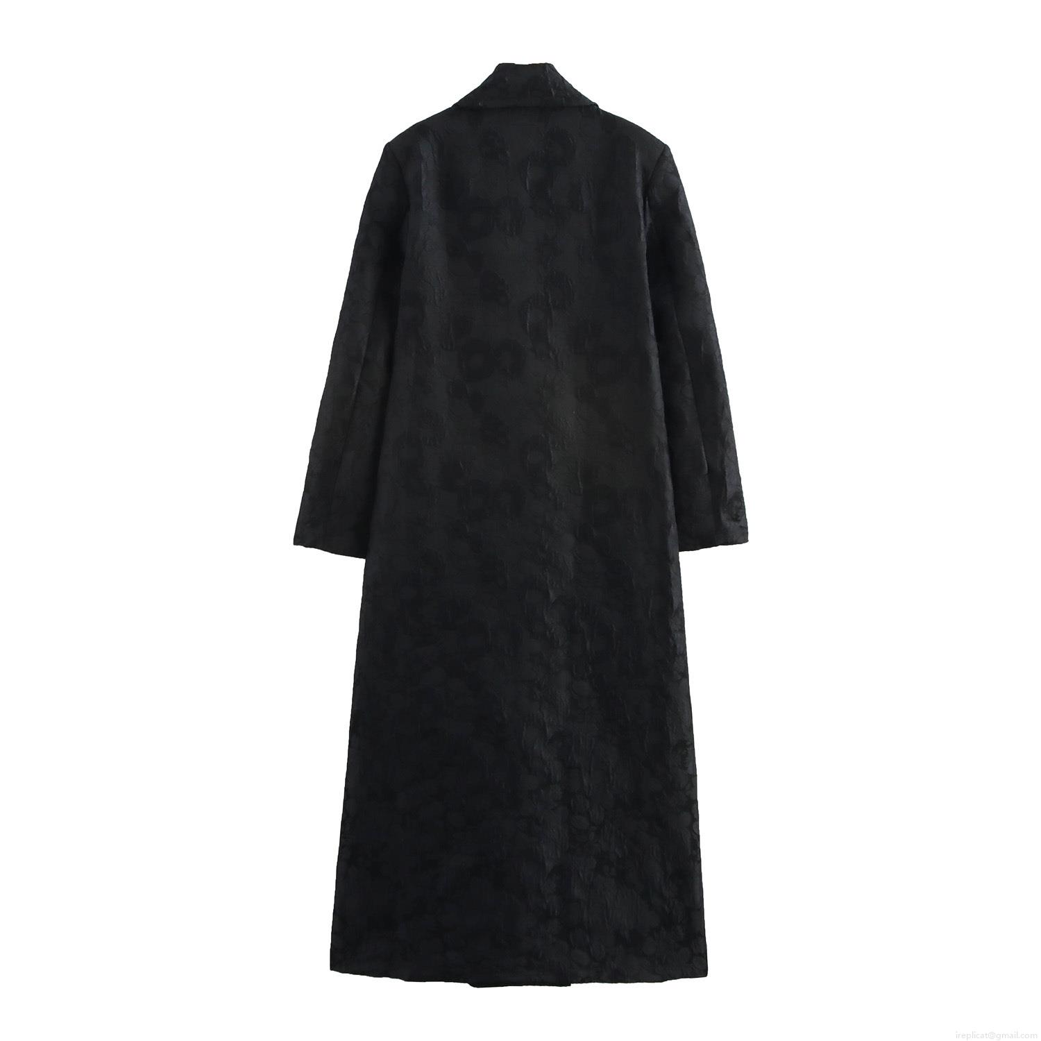 • Women's Sophisticated Black Jacquard Double Breasted Trench Coat With Suit Collar Gold Buttons Long Sleeve Loose Fit Extra Long Overcoat Fall Winter