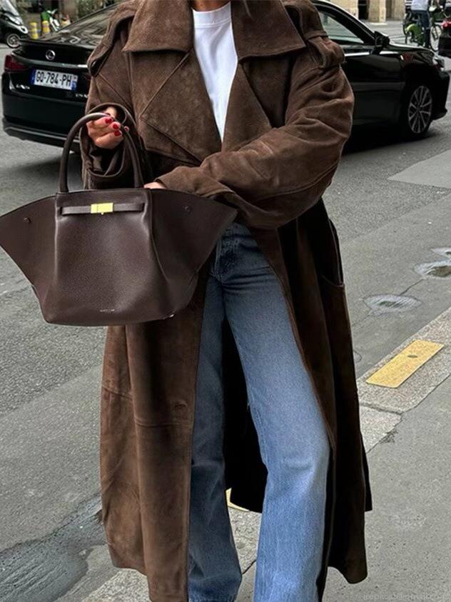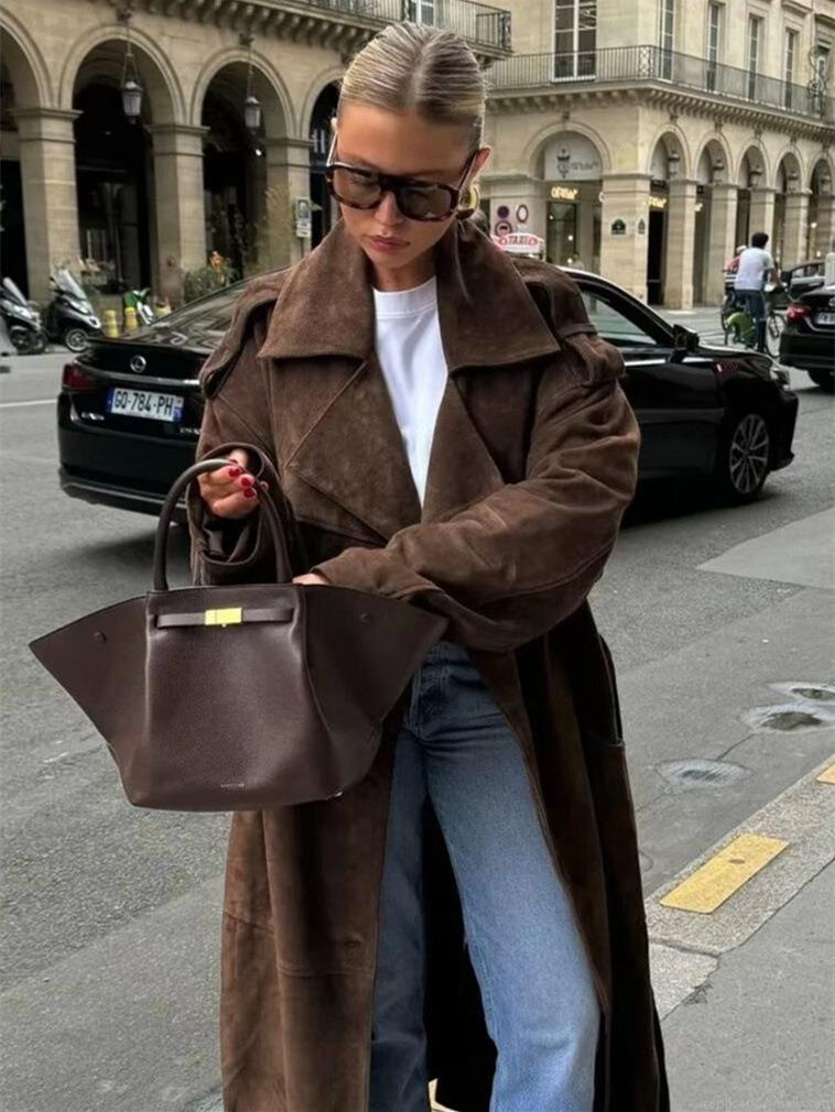 • Women's Suede Long Trench Coat Double-Breasted Windproof Maxi Overcoat With Belt Classic Lapel Epaulettes Streetwear Fashion Casual Jacket For Spring Autumn