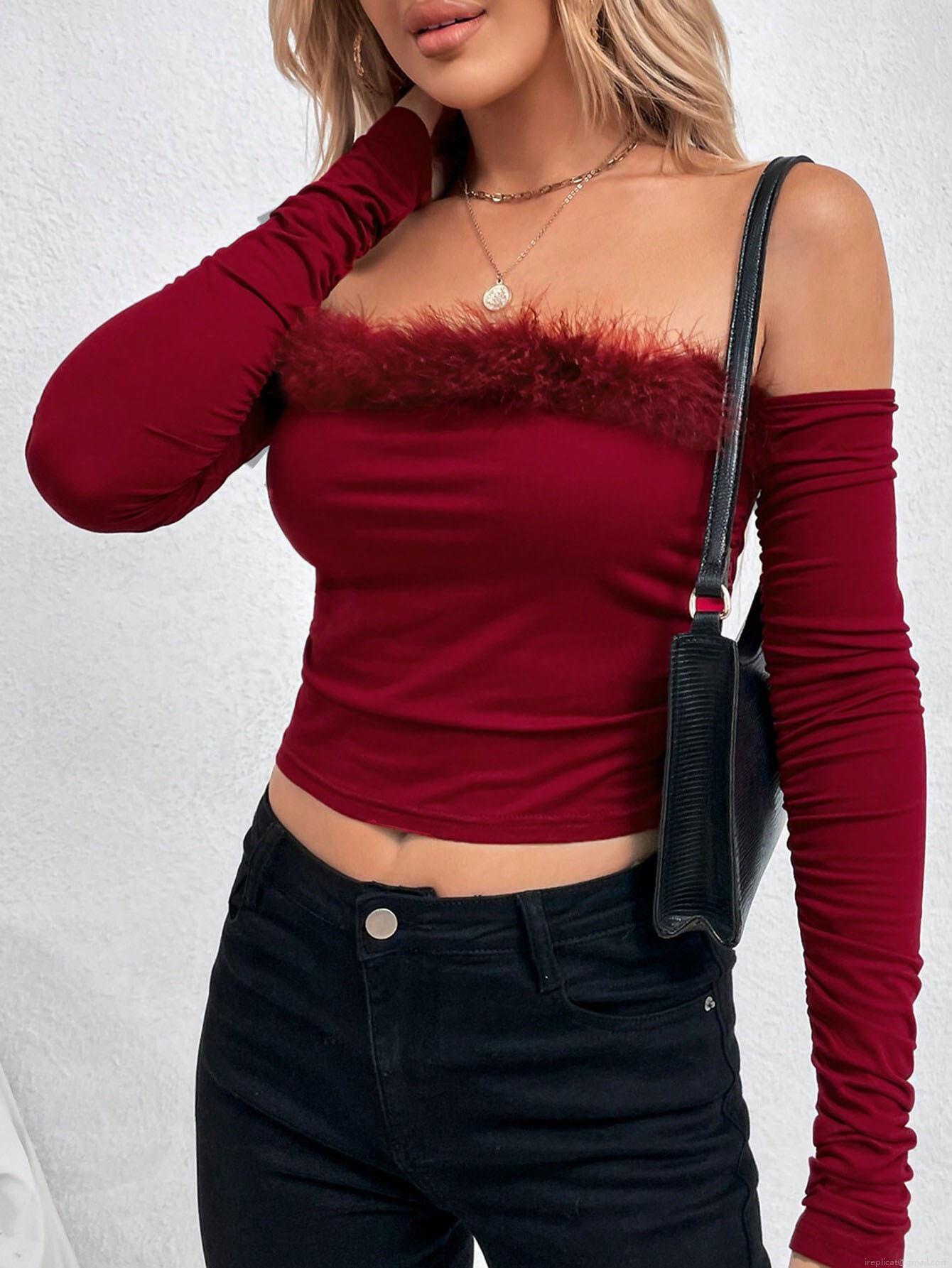 • Christmas Wine Red Off Shoulder Fur Collar T-Shirt Women Sexy Slim Fit Long Sleeve Knit Top With Faux Fur Trim Autumn Winter Party Clubwear